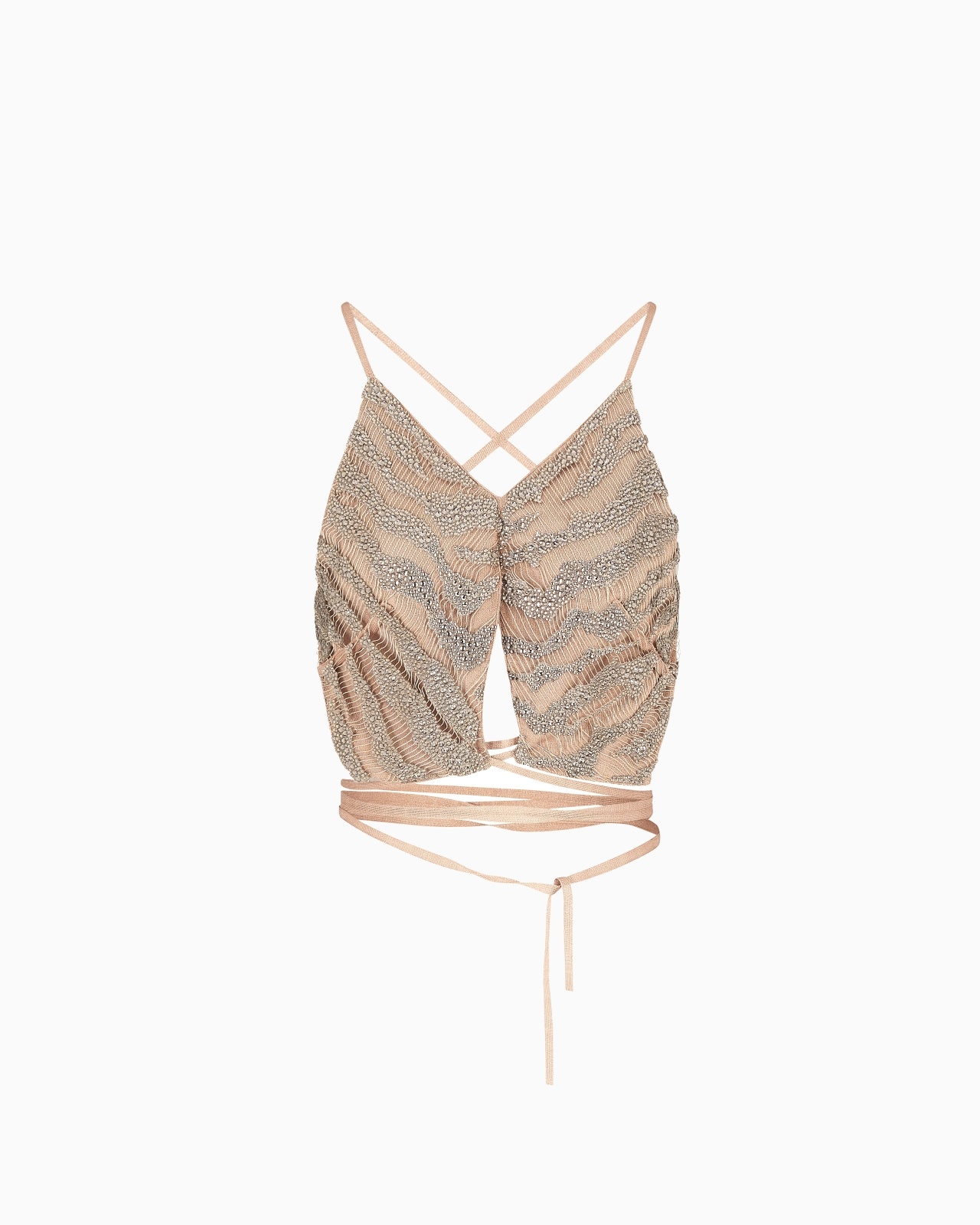 Delicate, elegant sensuality defines this exquisite ultra-fine silk and viscose knit top. The style, with its V neck and bare back, features contrasting embroidery made of silver rhinestones recalling the urban tiger theme that is repeated throughout the collection. A special piece, designed for the evening. V neck Embroidered all-over with the urban tiger motif Criss-crossed back shoulder straps Lace-up closure with viscose and silk ribbons Lined Made in Italy Product Code: GW001134AF15424U6071