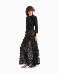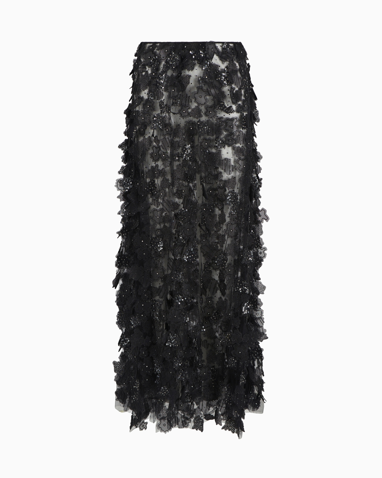 Elegant and delicately sensual skirt made of tulle, with flowing, lightweight lines. Small, delicate flowers embroidered with black beads, baguettes and crystals seem to dance across the black tulle base, giving the piece movement and three-dimensionality. The result of expert Italian craftsmanship, this unique, luxurious item designed for special occasions and exclusive events is completed by a zip fastening at the centre back and a black satin lining. Smooth waistband Back zip closure One tulle layer featuring embroidered petals with beads, baguettes and hand-applied sequins One layer of starlit-sky tulle Satin lining Length: 110 cm Made in Italy Product Code: GW000190AF12254ZZ017