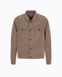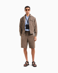 Blouson made of Lyocell canvas, a semi-synthetic fibre that is produced from eucalyptus trees and has an exceptionally low impact on the environment. It is valued for its excellent durability, capacity to absorb moisture, breathability and crease resistance. Embellished with a faded effect, it features a shirt collar, exposed button closure and flap patch pockets, details that highlight its versatile, modern spirit. <br>The piece is part of the Holiday selection that plays with a striking colour palette, incorporating black onyx, sky blue and ivory. These shades are combined with luxurious fabrics like linen and silk, and iconic ones, like cupro and Lyocell, creating a unique experience in texture. Modern, relaxed shapes dress up different occasions with unmistakable Giorgio Armani style. Shirt collar Exposed button closure Two patch pockets with flap and button Two snap-button side pockets Single-buttoned cuffs Unlined Length: 66 cm Made in Italy Product Code: GM001738TE16002U7001