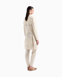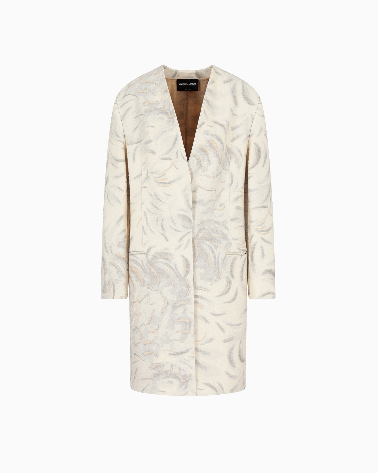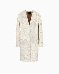 Sophisticated overcoat made of luxurious tussah silk in a delicate ivory colour. Featuring shawl lapels, a concealed button placket and side slits, the style is embellished with a sophisticated fil coupe knit with the urban tiger motif, the recurring theme of the entire ready-to-wear collection, which reinterprets the animal print in the brand’s hallmark style. A special piece designed to complete numerous looks with distinction. Shawl collar Concealed button closure Two front welt pockets Long side slits Canvassed style Length: 90 cm Made in Italy Product Code: GW000848TE14277F1079
