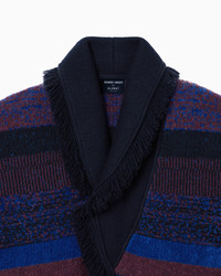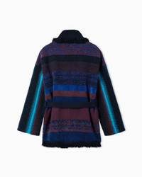 Elegant cardigan with shawl lapels, made in a luforurious cashmere blend with a cosy and enveloping feel. The style is enlivened by a motif that alternates horizontal and vertical stripes, giving it a refined touch. The fringed edges and waist belt that highlights the silhouette give the garment a distinctive and sophisticated allure. The garment is part of the Giorgio Armani for Alanui collection, which blends the Alanui free spirit with essential and sophisticated Giorgio Armani elegance, creating a new idea of luforury: casual, refined and modern, yet deeply rooted in tradition. Shawl collar Button under the collar Button closure Long sleeves Side pockets Belted waist Fringed trim Made in Italy Product Code: GM004835AF31017FB076