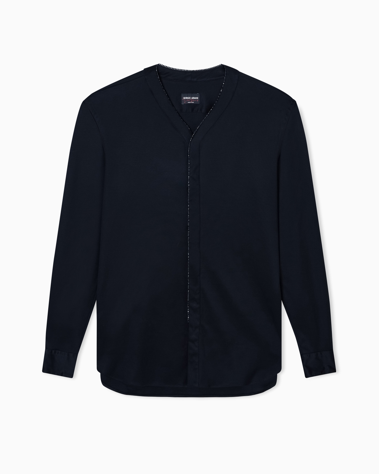 Elegant shirt made of silk interlock, with a fluid, sophisticated line. The style has a V neckline, concealed button closure, buttoned cuffs and sleeve placket, and is illuminated by piping made of black heat-adhesive rhinestones on the neckline and along the placket. This style is part of the Giorgio’s collection: the Giorgio Armani selection inspired by the evening world. Clean lines, attention to detail, an elegant night-time colour palette and the choice of luxurious materials define this modern and essential selection, providing the look for an effortless evening wardrobe. Product Code: GM000257TE104591UC001 Details Composition 100% Cotton V neck Concealed button closure Button cuffs Heat-sealed matching rhinestone piping detail Made in Italy Fitting The model is 188 cm tall and is wearing size 40