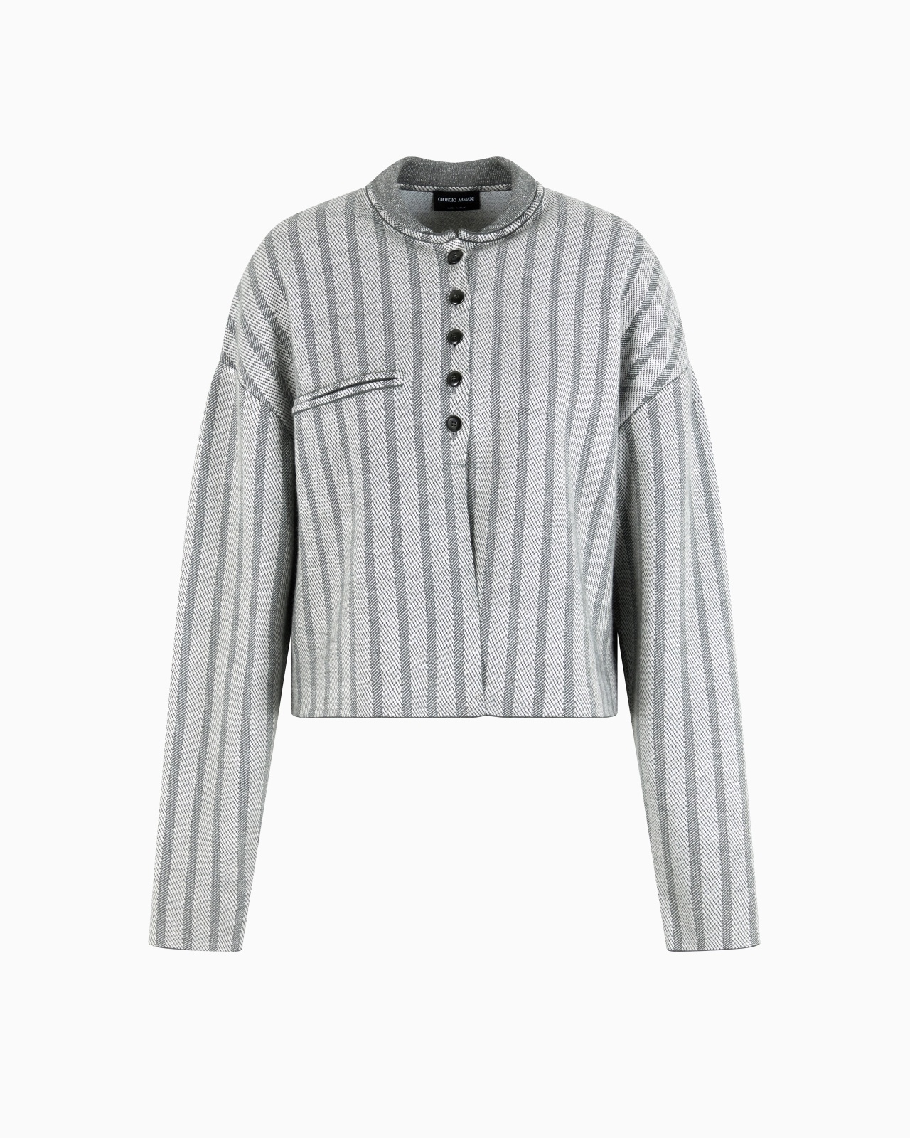 Distinctive jacket in a virgin wool-blend knit, enlivened by a chevron jacquard. The long-sleeved polo shirt style design features an visible button closure, baseball collar and welt pocket on the chest. A versatile item that perfectly completes laid-back looks. Fineness: 16 Baseball-shirt collar Closure with five exposed buttons Breast welt pocket Length: 54 cm Made in Italy Product Code: GW000889AF14917M8011