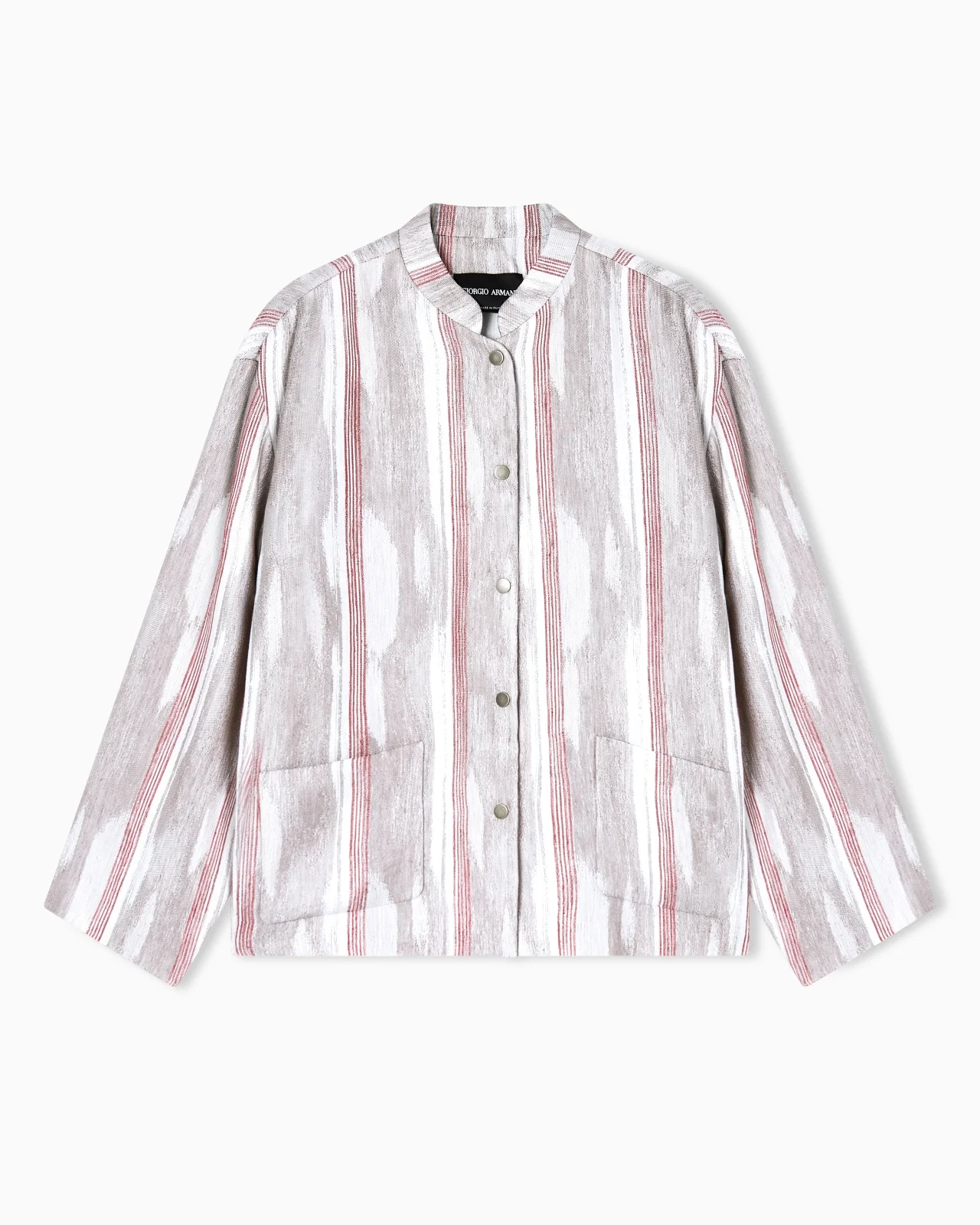The refined jacquard with a vertical striped motif is a feature of this distinctive linen and viscose jacket. The style has a guru collar and visible front buttoning with press studs. A sophisticated, versatile piece designed to complete daytime looks when worn with the collection’s trousers. The piece is part of the New Normal selection, an offering that reinterprets the brand’s archive looks with a modern twist. Pieces in fluid shapes and with an androgynous flavour dress the feminine silhouette with elegance for day-to-night looks. This season it is presented in a natural colour palette with a sophisticated and authentic simplicity. Guru collar Front closure with press studs Two patch pockets Length: 60 cm from the centre back Made in Italy Product Code: GW002776TE20118F6206