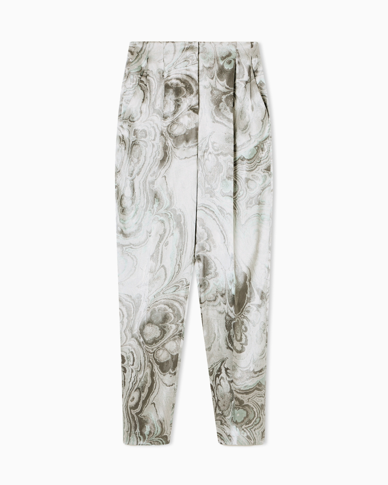 Single-pleat bright jacquard trousers featuring an essential construction, with a smooth waistband, hook and zip fastening and side pockets. Embellished with a motif inspired by semi-precious stones, they are perfect paired with a shirt or jacket from the collection for a sophisticated look. Single-pleat trousers Smooth waistband Zip closure Two side pockets Single back welt pocket Unlined Length: 115 cm Made in Italy Product Code: GW001569TE16783F1117