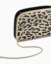 Satin clutch bag in a style that recalls a '90s aesthetic, made distinctive by laser-cut gold-coloured metal plates with an animal print. The bag retains its iconic shape, with rounded lines and darts at the corners, and features light-gold metal plating and a practical, detachable metal chain. Concealed magnetic closure Detachable shoulder chain Light gold-finish metal plating Animal-print motif with laser-cut gold-coloured metal plate Measurements: 21 x 4 x 15 cm Made in Italy Product Code: GW001000AF16353U8070