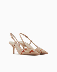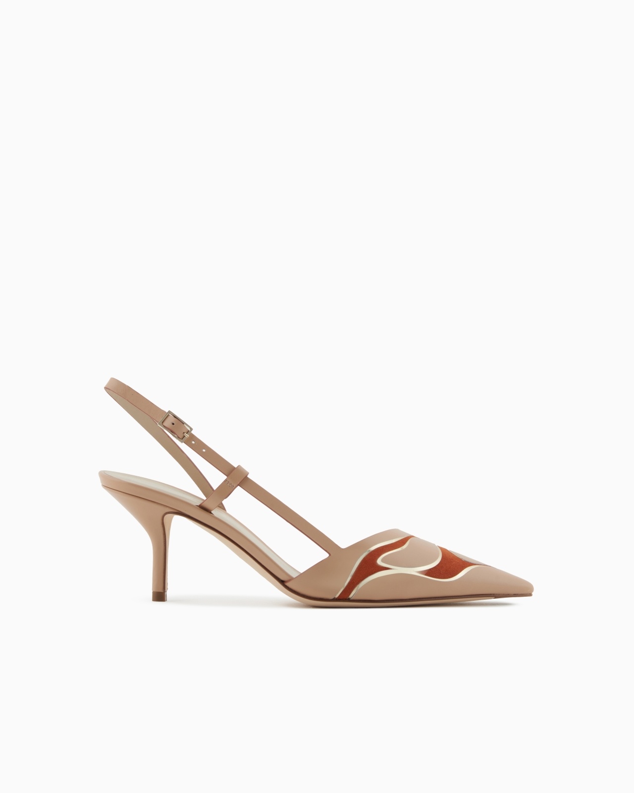 Elegant slingbacks made of leather and embellished with a contrasting animal print effect motif in suede, edged with mirrored leather. The style, with a slightly asymmetric top line, comes in the nature-inspired hues of the collection and features a stiletto heel at a comfortable height and ankle strap for a perfect fit. Delicate and feminine, they will complete numerous looks with a sophisticated touch. Pointed toes Slightly asymmetric top line Contrasting suede insert with gold mirror-effect leather detail Ankle strap Leather insoles Leather soles with rubber inserts Covered stiletto heel Heel height: 6.5 cm Made in Italy Product Code: X1E988XR348U692