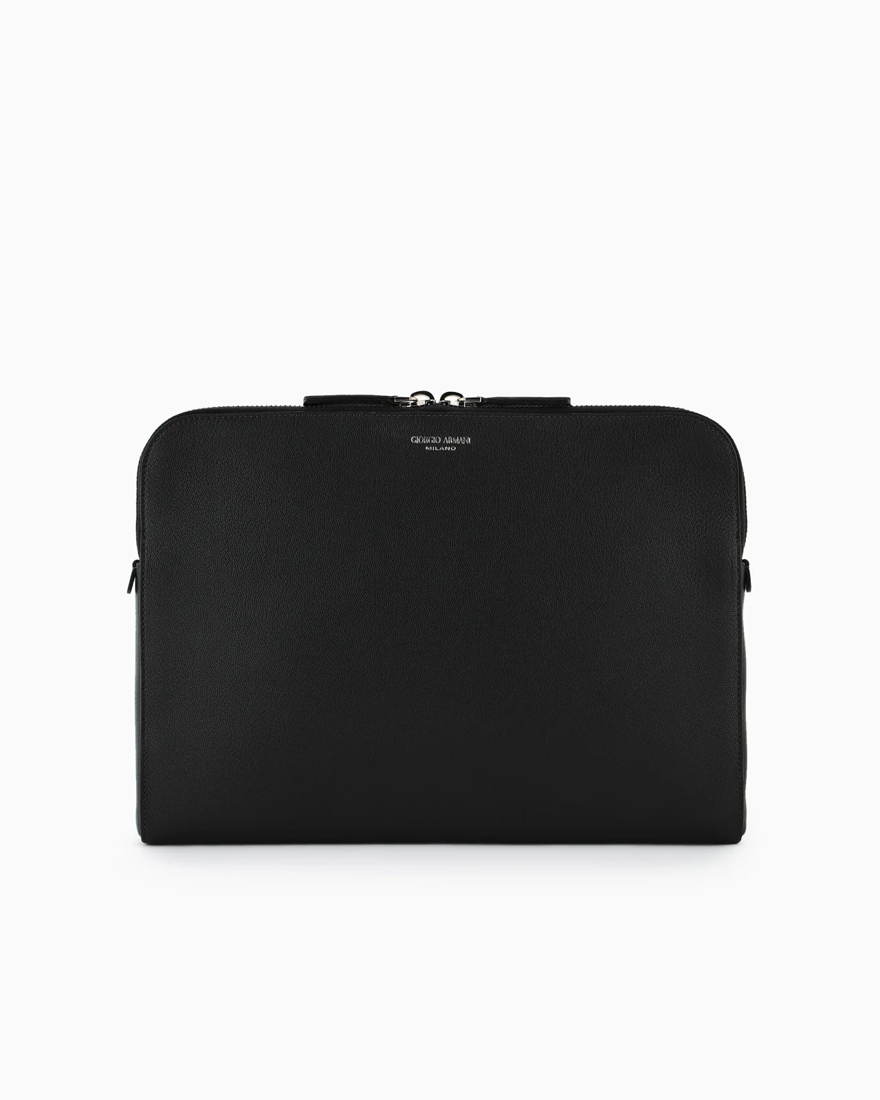 Spacious document holder made of pinpoint embossed calfskin. Featuring a double-slider zip fastening, cotton drill lining and a well-organised interior. The back loop allows it to be attached to a carry-on case, turning it into a useful accessory that is perfect for business travel. Product Code: Y2P276YR56J180001 Details Composition 100% Calf-skin leather Double-slider zip closure Fire-branded Giorgio Armani logo Shiny palladium hardware Internal card holder pocket Back loop detail for attaching to carry-on case Cotton drill lining Measurements: 26 x 36 x 3 cm Made in Italy