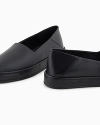 Loafers made of supple leather, featuring a square collar and extremely clean lines. The style features the sophisticated detail of a leather sole binding and is customised with the Giorgio Armani signature logo. A cosy, comfortable offering, perfect for a sophisticated and minimalist look. Calfskin loafers Square topline Collapsible reinforced heel Rubber monobloc soles Made in Italy Product Code: X2X200XF83000002