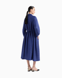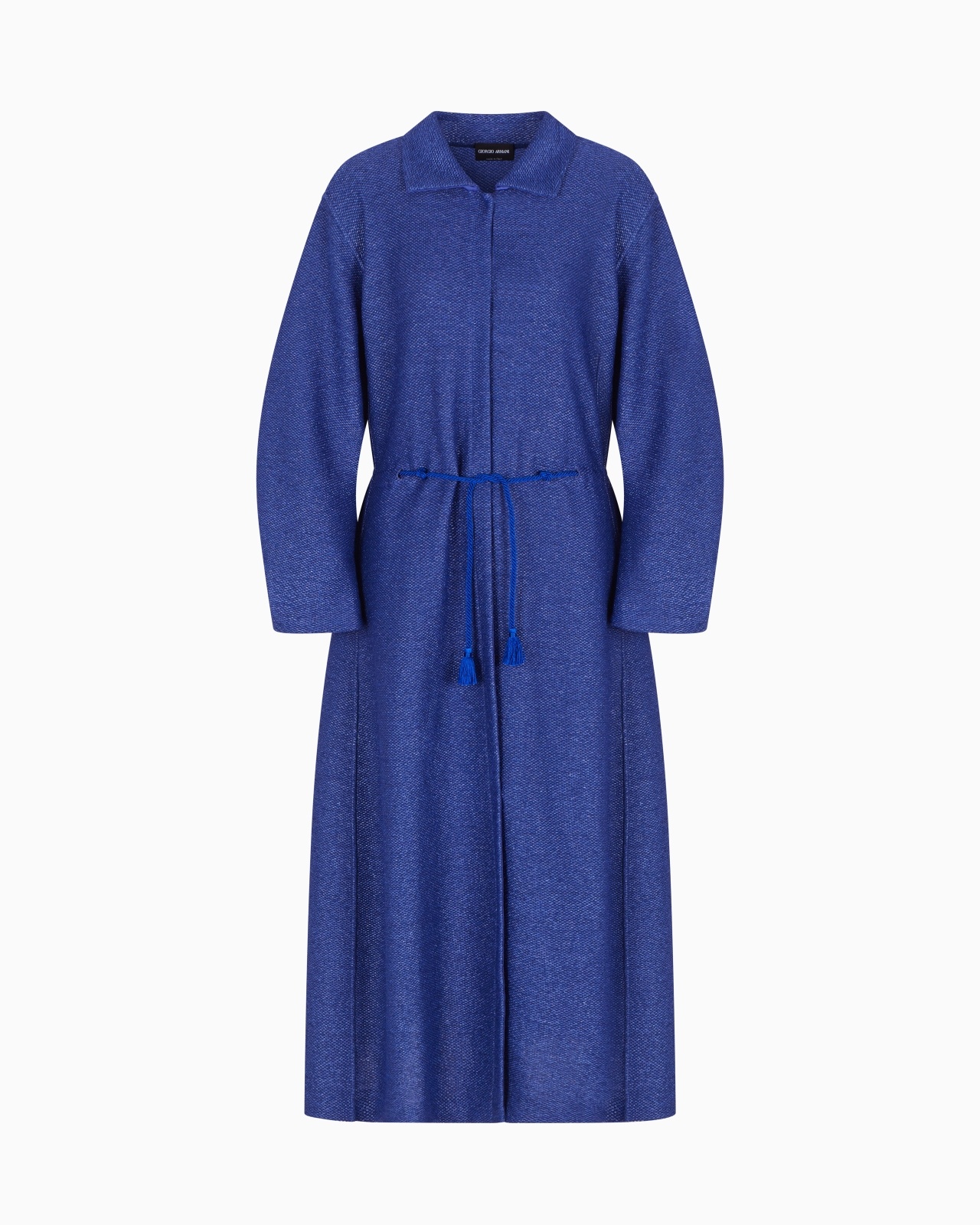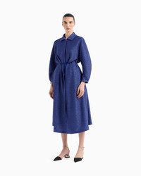 A distinctive coat made of lightweight raffia in the collection’s deep cornflower blue. The style features a drawstring waist, contoured long sleeves, a slit at the back and matching satin details, highlighting its feminine allure. A sophisticated item to pair with daytime looks for a laid-back look. Shirt collar Concealed zip closure Drawstring waist detail with fabric tassels Matching satin details Slightly rounded long sleeves Press studs at the cuffs Two inseam pockets Central back vent Unlined>Length: 120 cm from the waist Made in Italy Product Code: GW001182AF15651UB133
