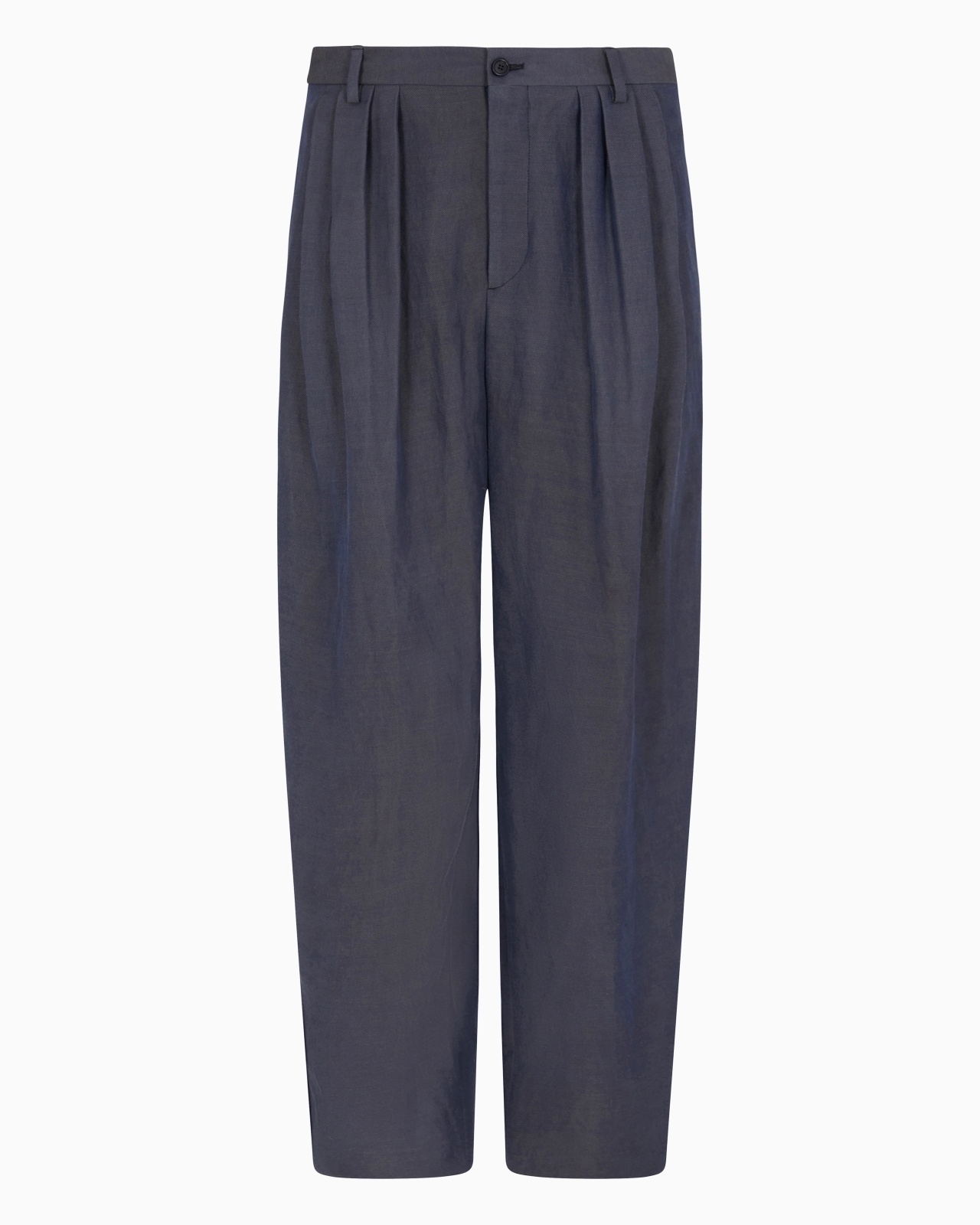 Two-pleat trousers made from linen and viscose twill that feel lightweight and have an unstructured silhouette. They feature a waistband with belt loops, a zip and button closure, side welt pockets and buttoned back pockets. This garment’s flowing deconstructed style reflects the Giorgio Armani aesthetic. Double-pleat trousers Waistband with belt loops Button and zip closure Two side welt pockets Two buttoned back pockets Cuff width: 20 cm Made in Italy Product Code: GM000927TE14480UB104
