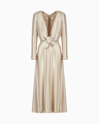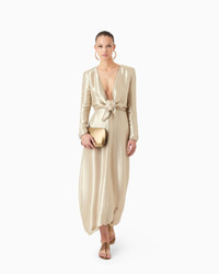 This long dress in an elegant champagne colour glows with a delicate and sophisticated lustre. The long-sleeved style features a deep V-neckline, held by a flower embellished with crystal-encrusted petals and piping made with tonal baguette-cut crystals. An exquisite eveningwear piece for the most elegant occasions in a delicate champagne colour. Product Code: 3SHVR054T04EY1PZ01 Details Composition 100% Polyamide Deep V-neckline Embroidered applied flower Applied petals with crystal embroidery Piping with baguette-cut crystals in tone Long sleeves Lightly gathered hem detail Partially lined Made in Italy