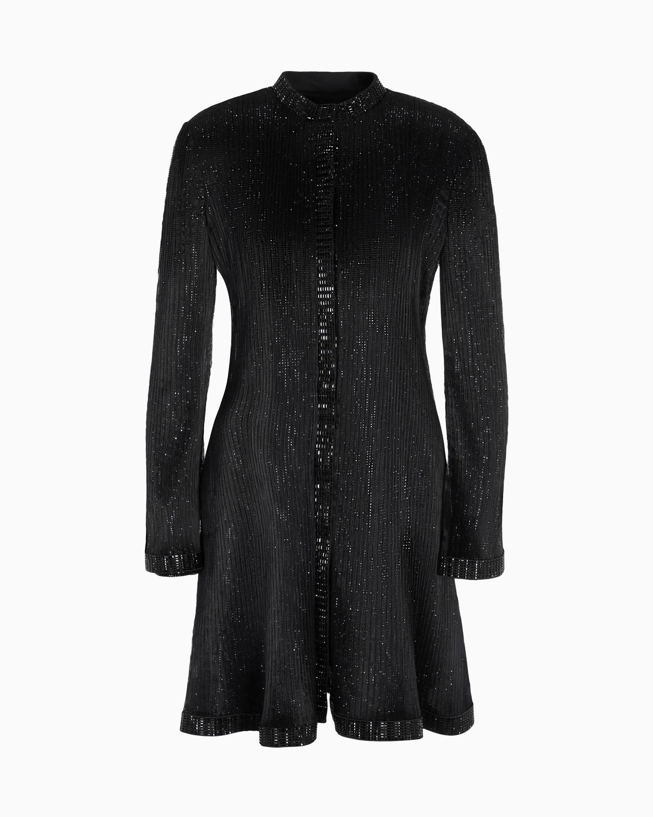A shower of bright black crystals adorns the lines of this long jacket crafted from pleated tulle. The exceptional and exquisite effect is created by the combination of the first layer in pleated tulle with a second layer covered all over in heat-sealed crystals. Embroidered piping with black baguettes finishes the piece, which has a concealed press-stud fastening and a slight flounce at the hem that adds movement. Pair it with the trousers in the same fabric for a total look designed to impress. Product Code: 3WHGR04WT04MT1PZ01 Details Composition 100% Polyester Small stand collar Concealed button closure Pleated tulle base layered with black tulle with matching heat-sealed pave rhinestones Edging on the collar, placket, cuffs and hem with black baguette embroidery and heat-sealed crystals Lined in black silk Length: 89 cm Made in Italy Fitting The model is 178 cm tall and is wearing size 38/S Italian Size