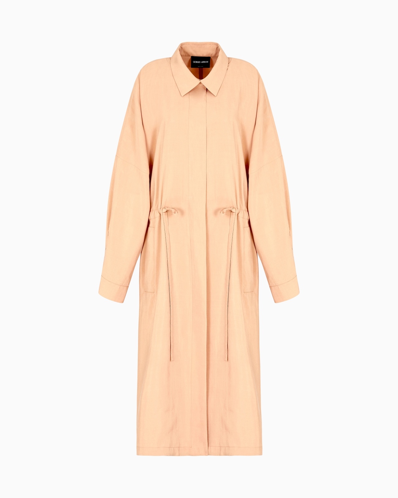 Sophisticated long overcoat made of washed technical silk, available in a refined clay colour. An elegant, luxurious offering, it features a drawstring with matching ribbons and wide sleeves brightened up by the distinctive yarn, perfect for pairing with other creations from the collection for chic looks with a romantic allure. Shirt collar Closure with concealed press studs Two vertical pockets Drawstring waist with matching ribbons Wide kimono sleeves Unlined Length: 135 cm Made in Italy Product Code: GW000930TE15682U6071