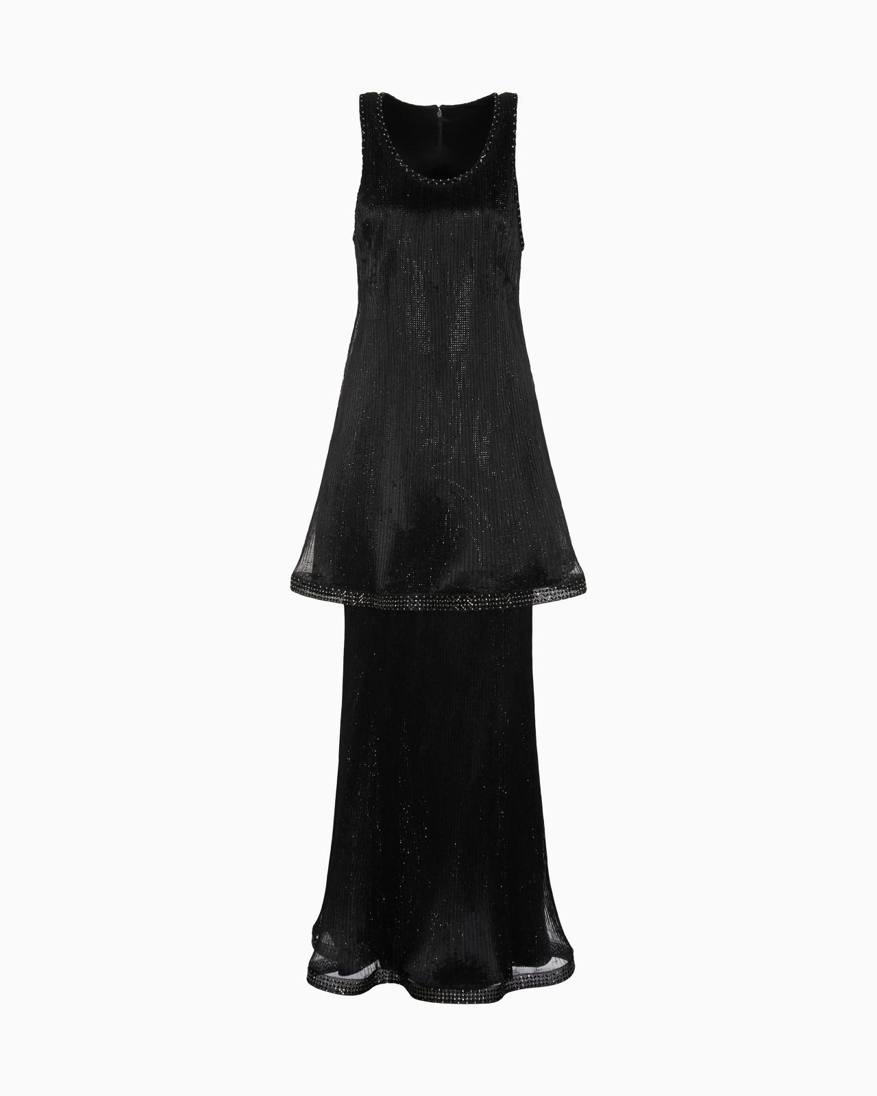 A shower of bright black crystals adorns the lines of this long dress crafted from pleated tulle. The exceptional and exquisite effect is created by the combination of the first layer in pleated tulle with a second layer covered all over in heat-sealed crystals. Embroidered edges with black baguettes finish the piece, with a concealed zip fastening and two lightweight frills adding movement. A piece designed to impress, perfect for evenings. Made in Italy Weight: 0.31 Kilogram Dress skirt shape: Mermaid Dress type: Evening Dress Sleeve length: Sleeveless Product Code: 3WHVR088T04MJPZ01