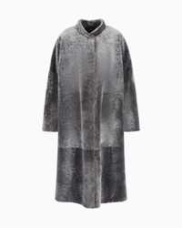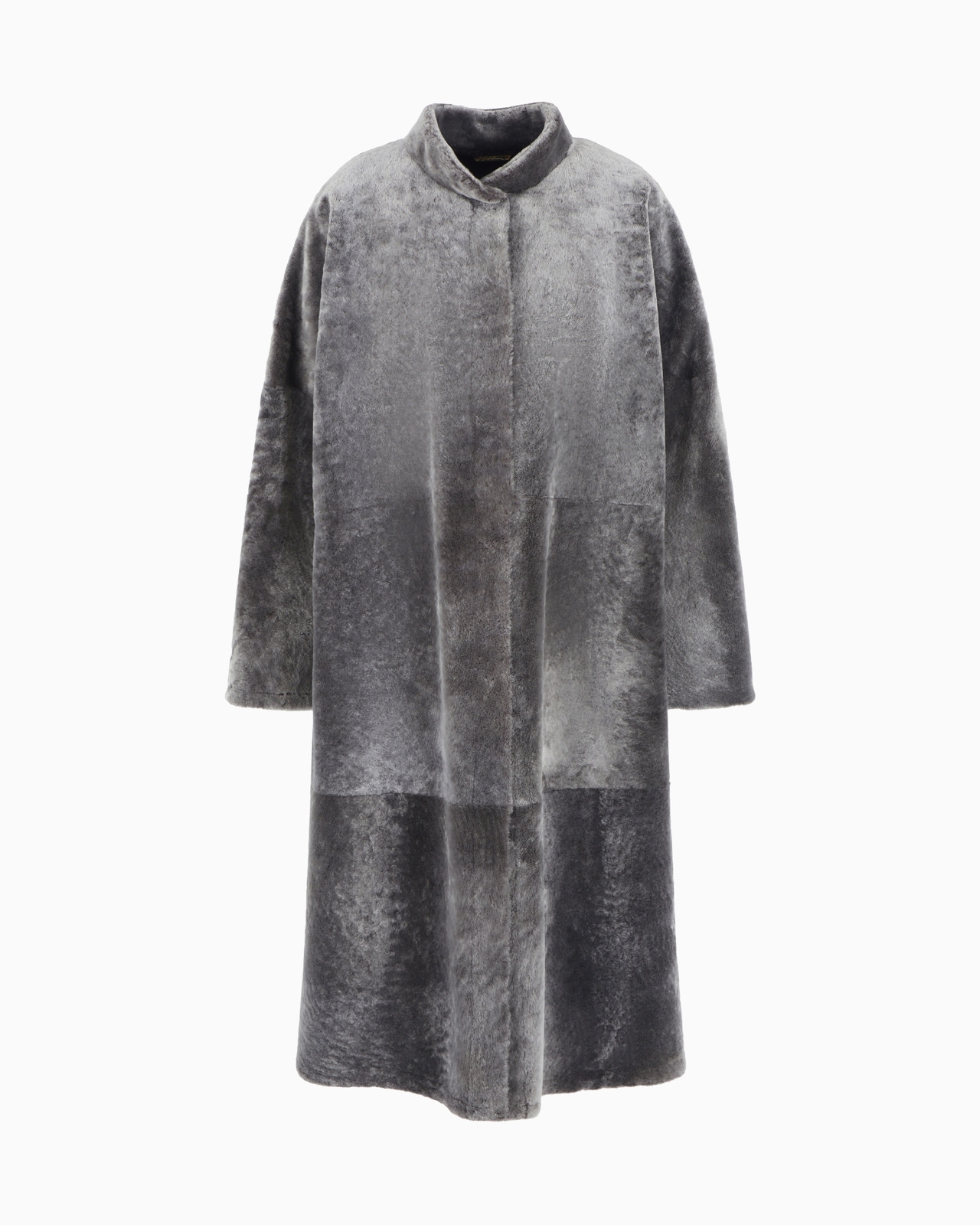 Made from lambskin shearling, this elegant long coat comes in a sophisticated shade of grey that brings out the garment’s lustre. The exquisite, refined style features a napped interior embellished with a collection print, a concealed press stud closure and side slits held by a nappa leather strap, creating volume and movement. It expertly provides a touch of style in a wide array of looks. Regular fit with wide volume Bomber jacket collar Front closure with concealed buttons Two large side slits with inset pockets Nappa leather side straps with cufflink closure Printed nappa leather interior Length: 110 cm from the centre back Made in Italy Product Code: GW000339AF11857U8122