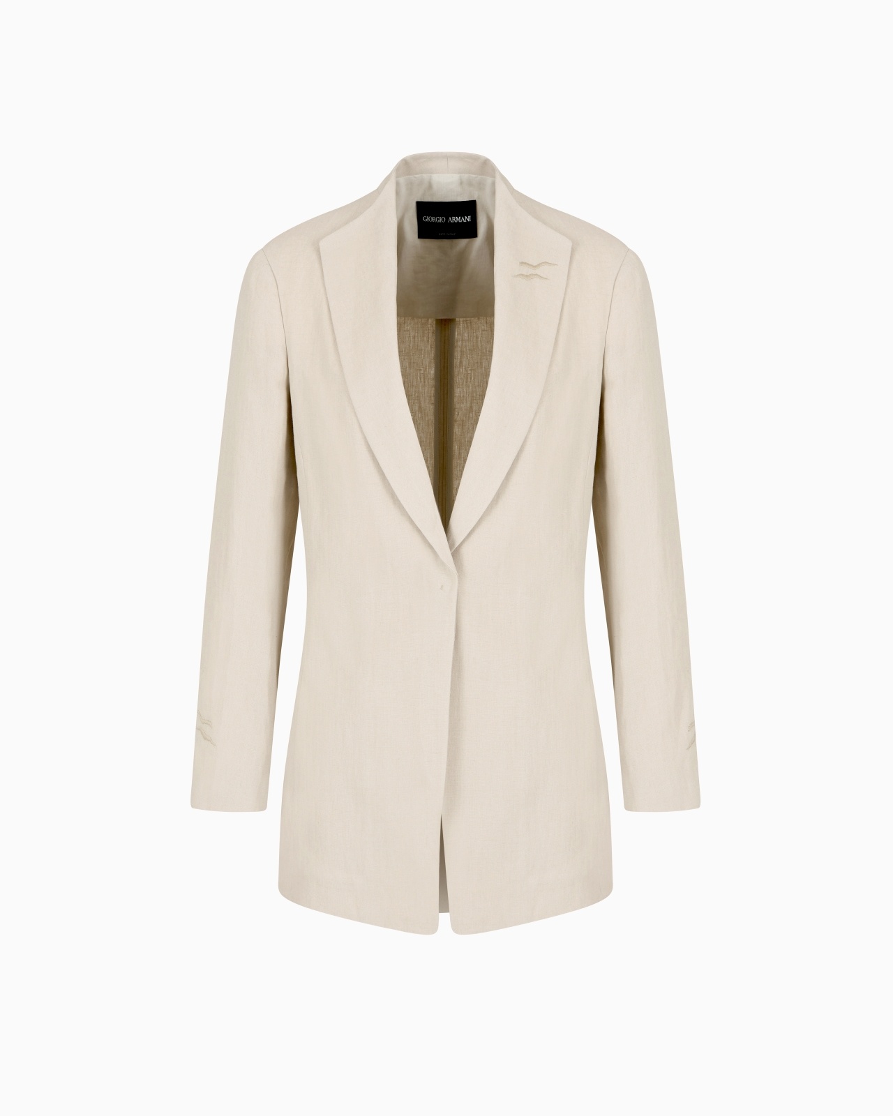 This single-breasted jacket is made from fresh linen with a comfortable, silky feel and has a fluid, unstructured silhouette. The single-breasted style has side slits and is embellished with a matching embroidery on the lapel recalling the urban tiger theme that repeats throughout the collection. Pair it with the trousers in the same fabric to create effortlessly chic outfits. Single-breasted jacket Single lapel Single-breasted closure with concealed button Two side pockets Back vents Matching embroidery on the lapel Partially lined Length: 75 cm Made in Italy Product Code: GW000847TE11126U8048