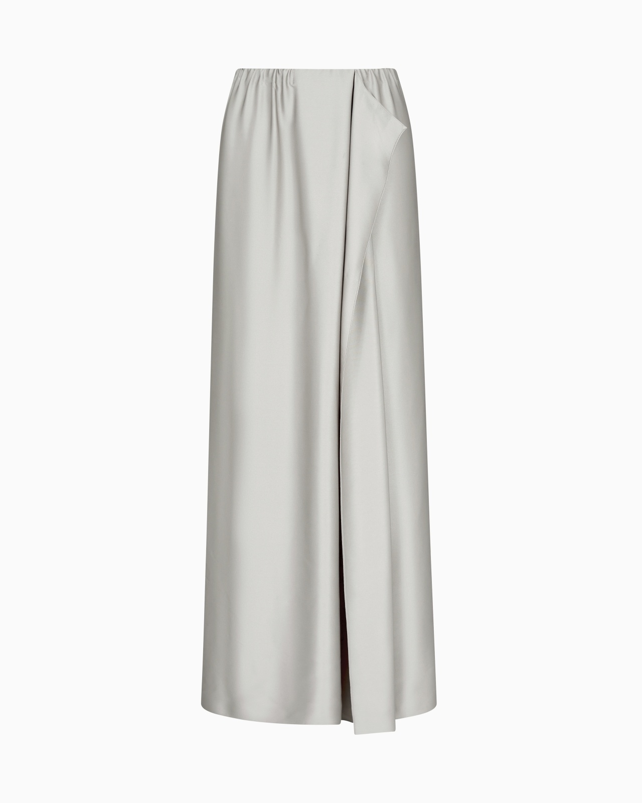 Double silk satin long skirt with clean, essential lines. The style, with an elasticated waistband and small darts, is made special by the front draped detail, which adds movement. An elegant, sophisticated offering, perfect for completing a wide array of looks. Elasticated waist Front pleats Front draping Length: 110 cm from the waist Made in Italy Product Code: GW000806TE10101U8045