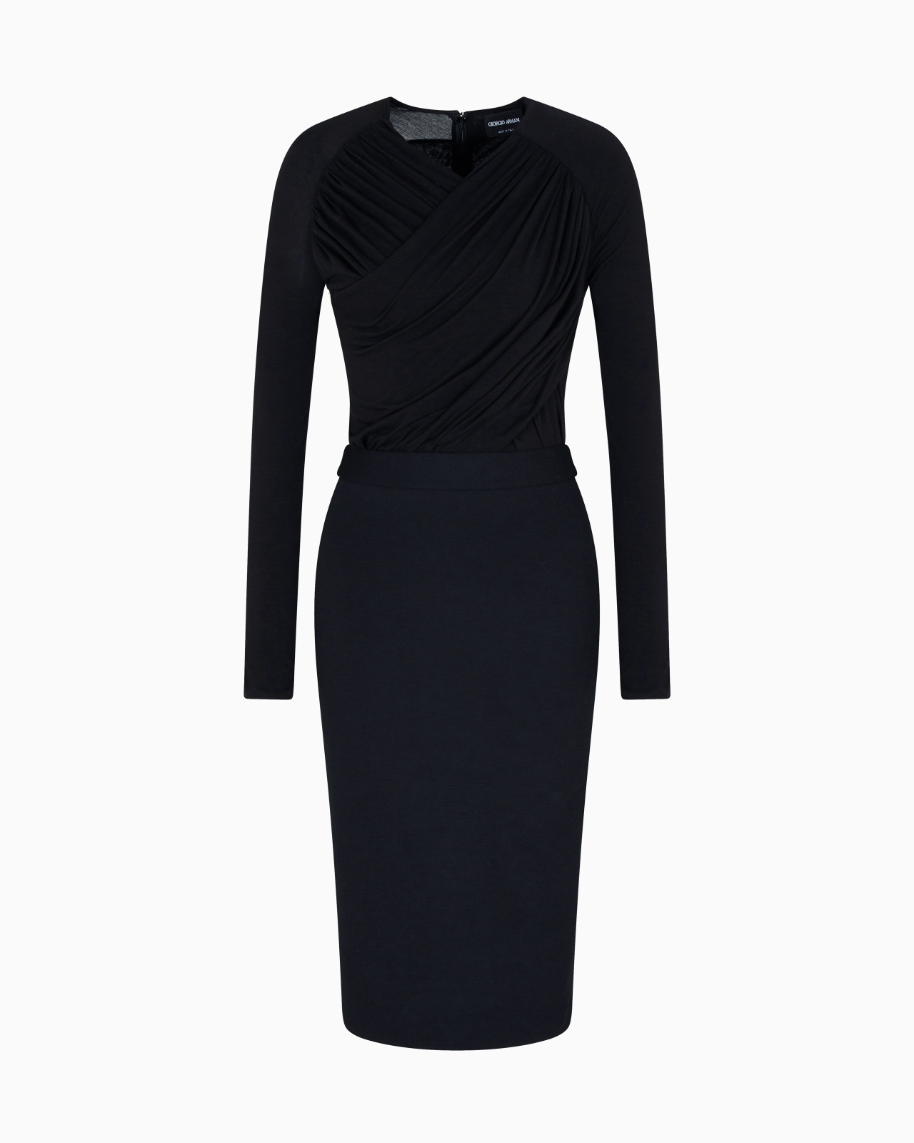 Midi dress made of Lyocell jersey, a semi-synthetic fibre that is produced from eucalyptus trees and has an exceptionally low impact on the environment. It is valued for its excellent durability, absorbency, breathability and crease resistance. The piece is distinguished by its front drape that elegantly wraps around the bodice, creating a flattering cross-over effect. Long sleeves and a figure-hugging pencil skirt define the garment’s feminine, tapered silhouette, making it perfect for wearing on various occasions. V neck Long sleeves Cross-over draping on the bodice Back central concealed zip fastening Central back vent Length: 65 cm from the waist Made in Italy Product Code: GW002160AF15963UC001