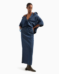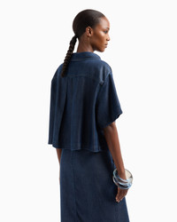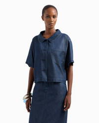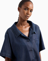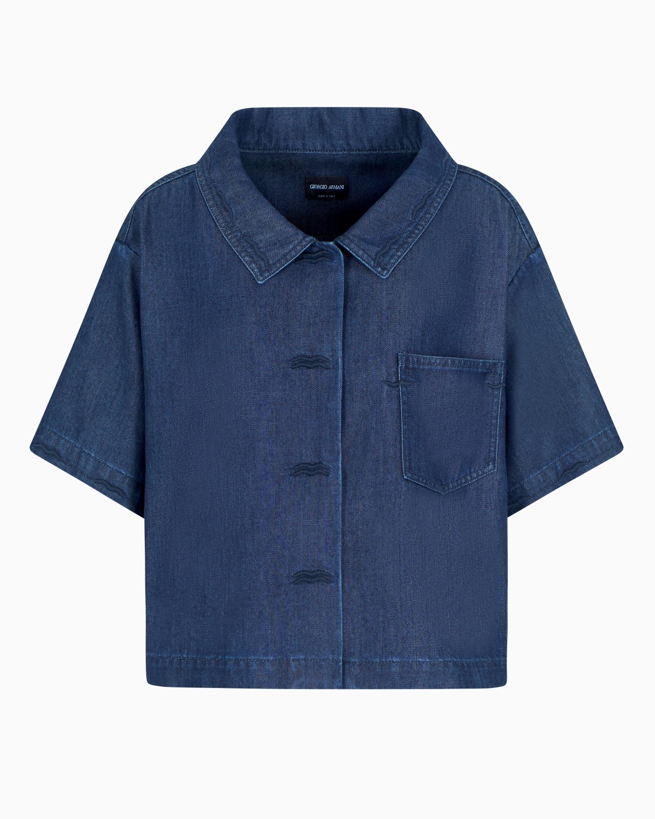 This short-sleeved Lyocell shirt reinterprets denim in a fresh, feminine and new manner. The style, with a pointed collar, patch pocket and wide elbow-length sleeves, is distinguished by its relaxed volume and slightly boxy design, enlivened by box pleats at the back. It’s both laid-back and chic, making it the perfect complement to numerous looks. Point collar Button closure Elbow-length sleeves Breast patch pocket Small matching wave embroidery detail Back box pleats Unlined Made in Italy Product Code: GW000765AF15323UB112