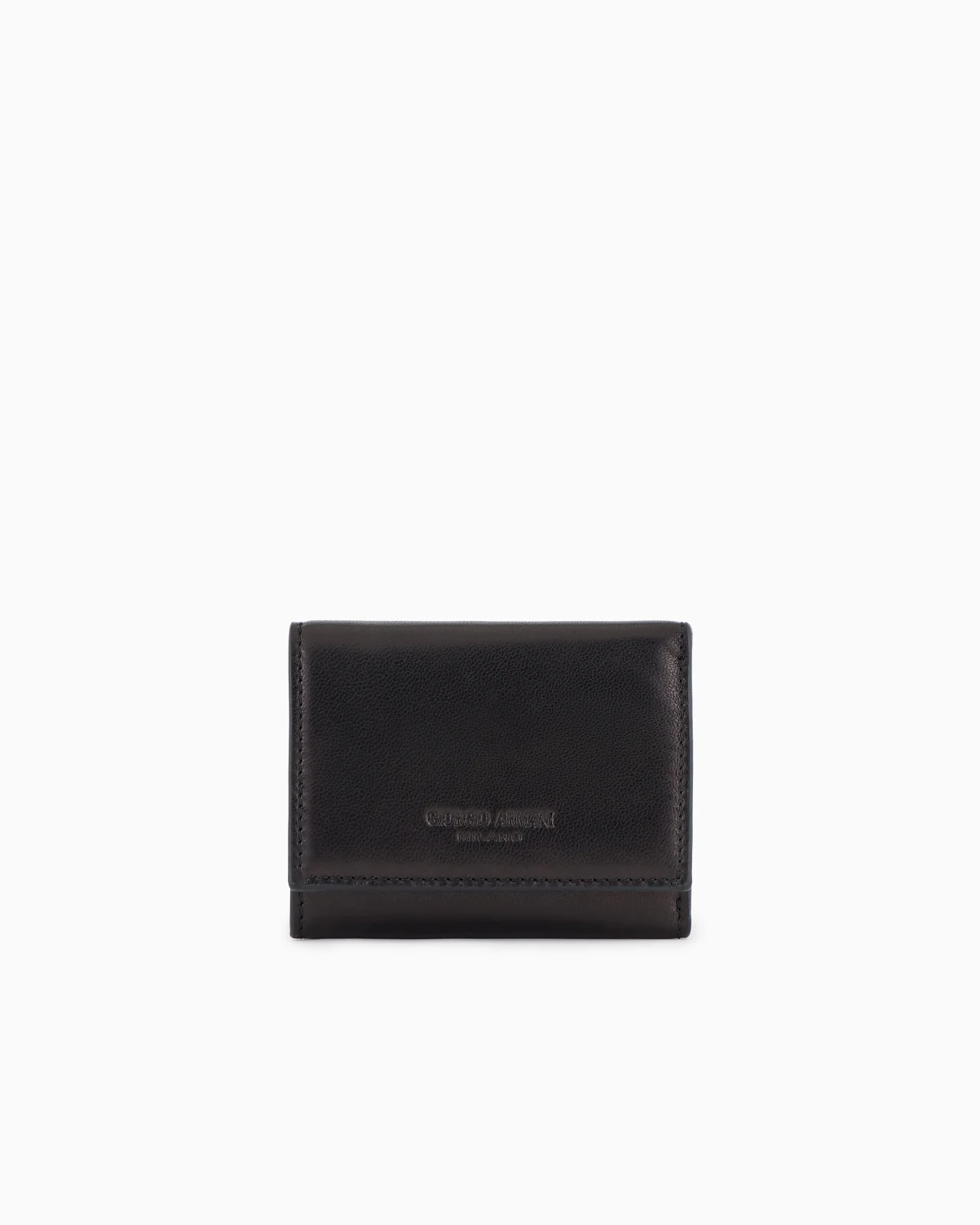 Trifold wallet made of nappa leather with an extremely soft and luxurious feel. Customised with a heat-stamped Giorgio Armani logo, the style features two compartments for banknotes and receipts with a snap-button closure. Product Code: Y2R728YS97J180001 Details Composition 100% Lambskin Snap closure Two interior banknote and receipt compartments Fire-branded Giorgio Armani logo Made in Italy