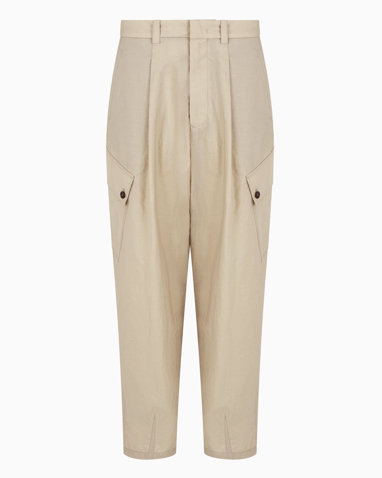 With a modern design and comfortable fit, these cargo-inspired single-pleat trousers are crafted from cotton canvas with a silky feel. The style features a waistband with belt loops, a zip and button closure and two side pockets with buttons. Highly versatile, when worn with a jumper and deconstructed jacket they complete an array of diverse looks – from urban attire to casual-chic styles. Single-pleat trousers Waistband with belt loops Button and zip closure Two side pockets Two side pockets with buttons Two back patch pockets Cuff width: 19 cm Made in Italy Product Code: GM001337TE15103U6223