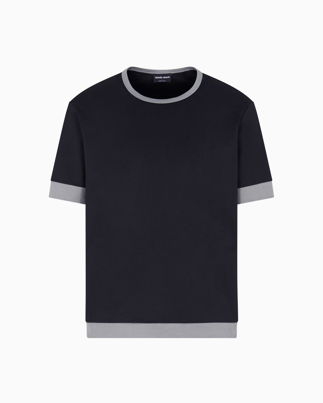 Crew-neck T-shirt made from organic cotton jersey with an extremely soft and comfortable feel. The modern style with a relaxed attitude is finished with contrasting edges. <br>The piece is part of the Holiday selection that plays with a striking colour palette, incorporating black onyx, sky blue and ivory. Such shades are combined with luxurious fabrics like linen and silk, and iconic ones, like cupro and Lyocell, creating a unique experience in texture. Modern, relaxed shapes dress up different occasions with unmistakable Giorgio Armani style. Crew neck Short sleeves Contrasting collar, armholes and hem Made in Italy Product Code: GM001948TE10333UC001