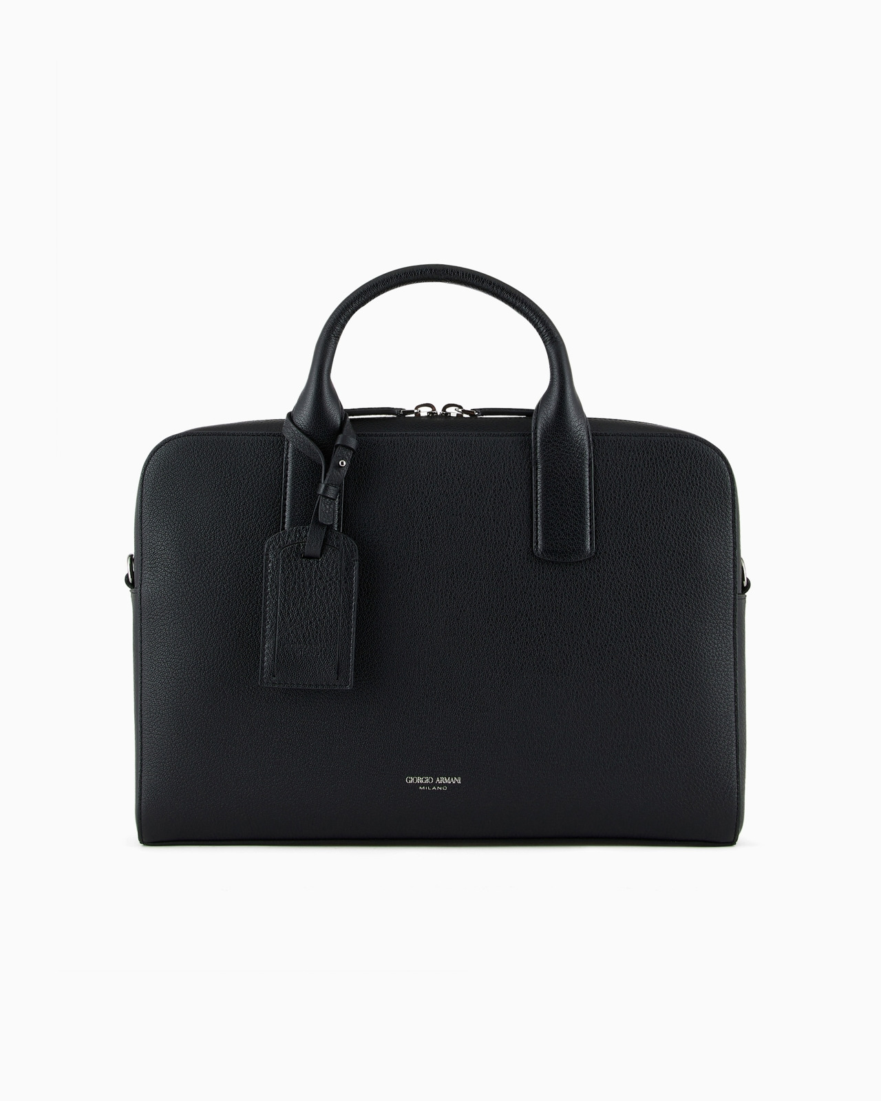 Elegant briefcase made of pinpoint embossed calfskin. The style has a covered tubular double handle, double-slider zip fastening and a convenient adjustable, detachable shoulder strap, allowing it to be carried in two ways. The interior is lined with cotton drill and features a laptop compartment, interior pocket and cardholder patch pocket. Product Code: Y2P275YR56J180001 Details Composition 100% Calf-skin leather Double tubular leather handle Oversized double-slider zip closure Zipped inner pocket Cotton drill lining Padded laptop compartment Cardholder patch pocket Heat-stamped Giorgio Armani logo Adjustable, detachable leather shoulder strap Measurements: 39 x 28 x 5 cm Made in Italy