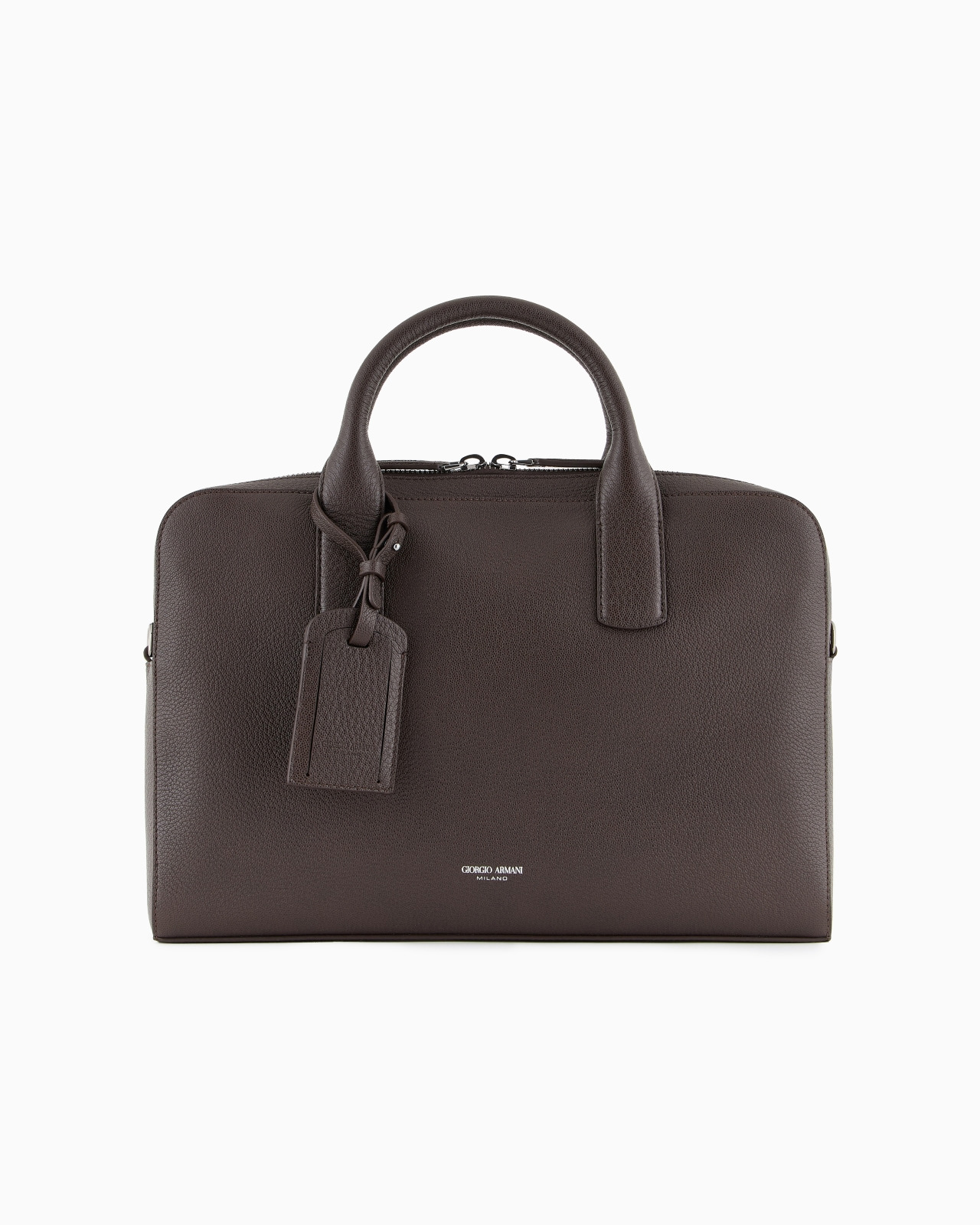 Elegant briefcase made of pinpoint embossed calfskin. The style has a covered tubular double handle, double-slider zip fastening and a convenient adjustable, detachable shoulder strap, allowing it to be carried in two ways. The interior is lined with cotton drill and features a laptop compartment, interior pocket and cardholder patch pocket. Double tubular leather handle Oversized double-slider zip closure Zipped inner pocket Cotton drill lining Padded laptop compartment Cardholder patch pocket Heat-stamped Giorgio Armani logo Adjustable, detachable leather shoulder strap Measurements: 39 x 28 x 5 cm Made in Italy Product Code: Y2P275YR56J80005