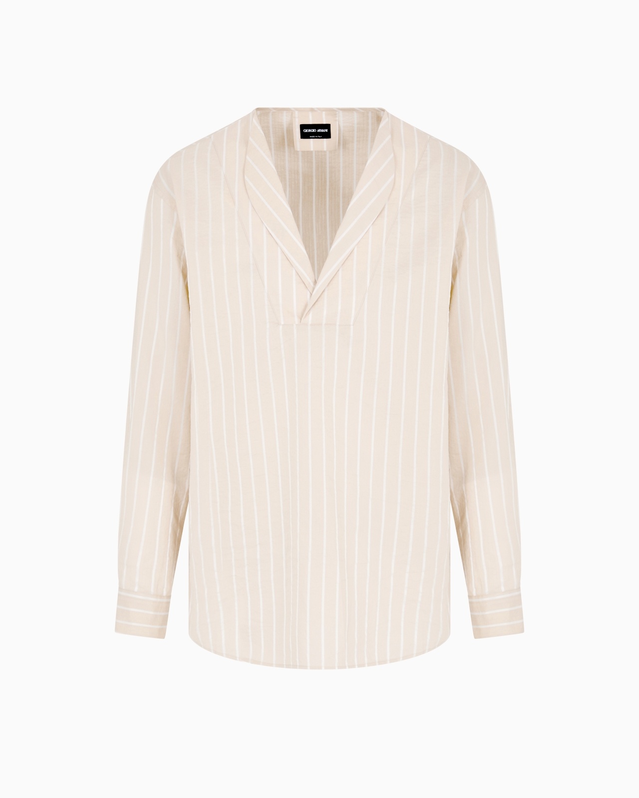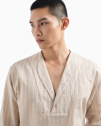 Loose fit and a relaxed look for this distinctive polo shirt crafted from cotton, silk and viscose with a pinstriped motif. The style has a collar with shawl lapels, buttoned cuffs with a sleeve placket and rounded hem, making it perfect for completing outfits with a relaxed and sophisticated style, suitable for various occasions. Loose fit Collar with shawl lapels and V neck Cuffs with button and sleeve placket Rounded hemline Made in Italy Product Code: GM001418TE14526M6021