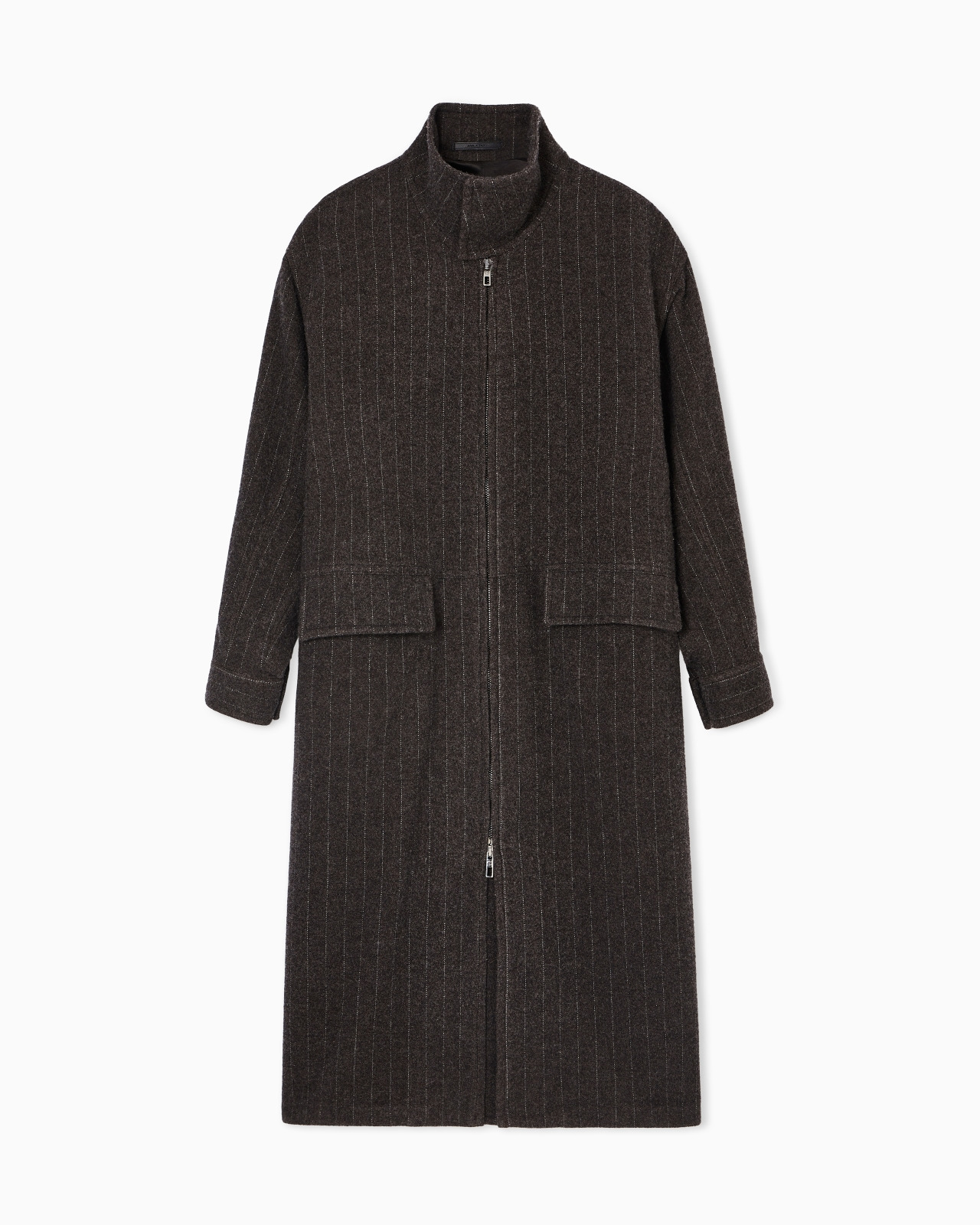 Elegant, pinstriped “A” line coat in wool and cashmere cloth with generous volumes. The style features a stand collar with buttons, a full-zip fastening with a double pull tab, flap pockets and wide slits that emphasise its essential yet enveloping construction. A modern offering, perfect for elegantly completing both formal and informal looks. Stand collar with buttons Front zip closure with double pull tabs Two front flap pockets Sleeve cuffs with buttoned openings Back vent with strap Lined Length: 130 cm Made in Italy Product Code: GM002276TE17771F8025