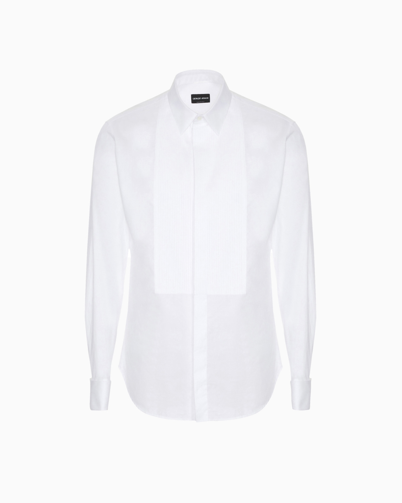 This slim-fit shirt is made from luxury cotton twill. Its unique, large, front faced placket evokes a tuxedo shirt plastron and is embellished with a pleated motif that creates a three-dimensional effect. A style that perfectly completes elegant evening looks. Product Code: 9SGCCZ5RTZ2651F0BN Details Composition 100% Cotton Slim fit Pleated bib Wing-tip tuxedo collar with bow tie cover Back yoke Back darts Fastened with mother-of-pearl buttons French seams Double cuffs Made in Italy Fitting The model is 188 cm tall and is wearing size 40