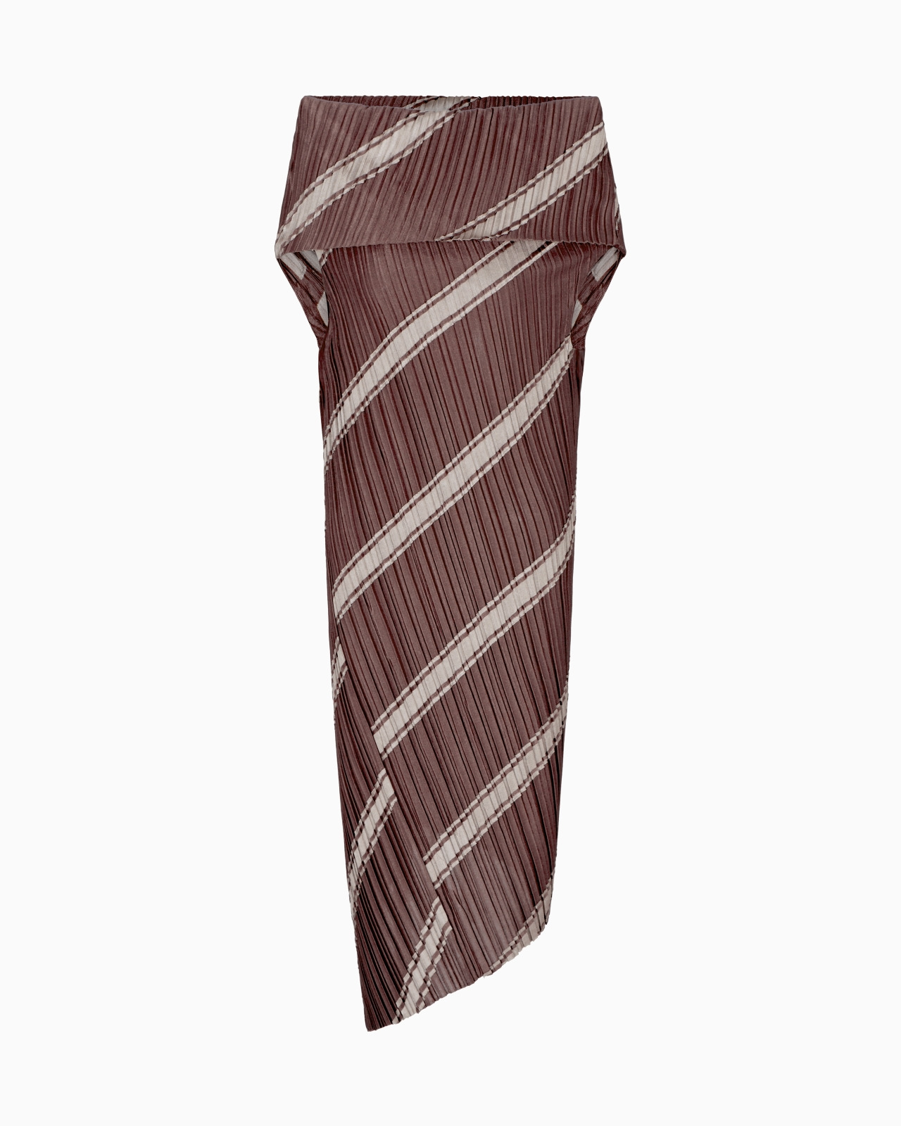 Midi dress made of jersey, embellished with a two-tone print with oblique stripes with irregular pleating adding movement. A style that elegantly follows the feminine silhouette, featuring a wide shawl neckline and asymmetric hem. The piece is part of the New Normal selection, an offering that reinterprets the brand’s archive looks with a modern twist. Pieces in elongated and fluid shapes and with an androgynous flavour dress the feminine silhouette with elegance for day-to-night looks. This season it comes in a natural colour palette animated by a series of chevron motif and houndstooth shapes, a clear reinterpretation of pieces "stolen" from the male wardrobe with a feminine twist. Wide shawl collar Sleeveless Asymmetric hemline Length: 112 cm from centre back Made in Italy Product Code: GW002076AF17752F6007