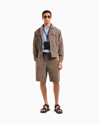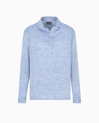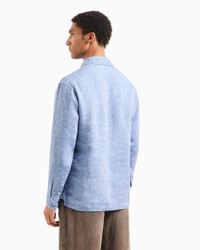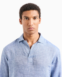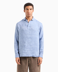 Long-sleeved shirt in pure linen canvas with a fresh spirit and relaxed allure. Featuring an open polo shirt collar, buttoned cuffs and side slits, it complements casual looks teamed with the collection's trousers and Bermuda shorts. <br>The piece is part of the Holiday selection that plays with a striking colour palette, incorporating black onyx, sky blue and ivory. These shades are combined with luxurious fabrics like linen and silk, and iconic ones, like cupro and Lyocell, creating a unique experience in texture. Modern, relaxed shapes dress up different occasions with unmistakable Giorgio Armani style. Open polo-shirt collar Long sleeves Button cuffs Side slits Made in Italy Product Code: GM000316AF18950U9328
