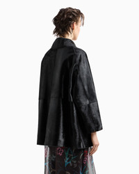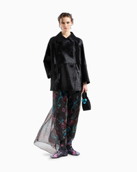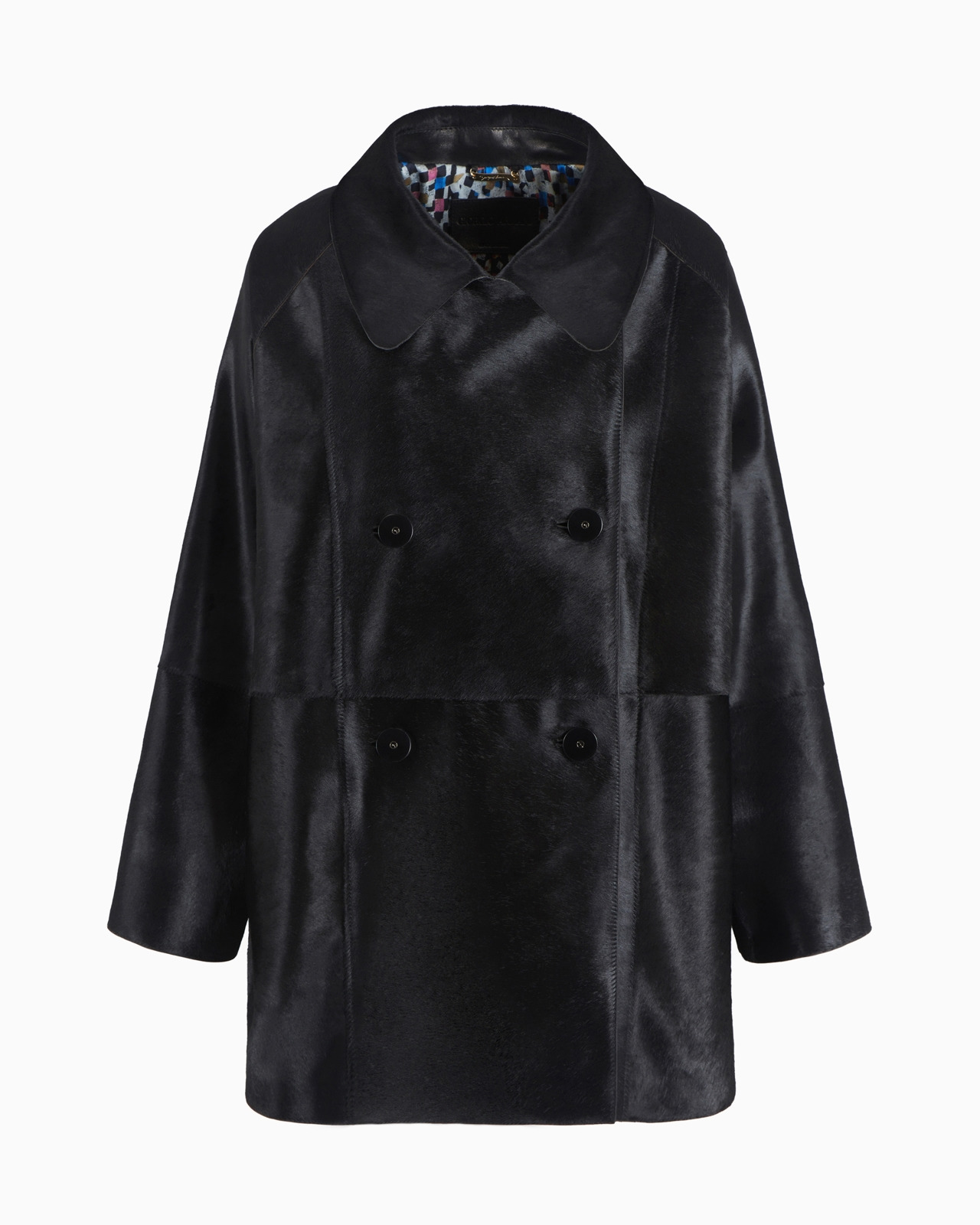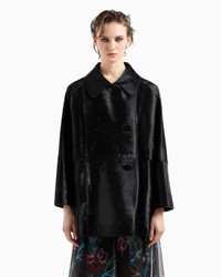 Double-breasted pea coat made of leather featuring a distinctive pony skin effect that is very bright and soft to the touch. The entirely raw-cut style with matching waxed profiles and smooth nappa leather details, elevates different looks thanks to its clean and essential lines. Collar with rounded lapels Double-breasted closure with logo buttons Raw-cut style with matching waxed edges Monochromatic lightweight nappa leather interior details and undercollar details Lined in matching silk twill Length: 73 cm Made in Italy Product Code: GW000352AF11869UC001