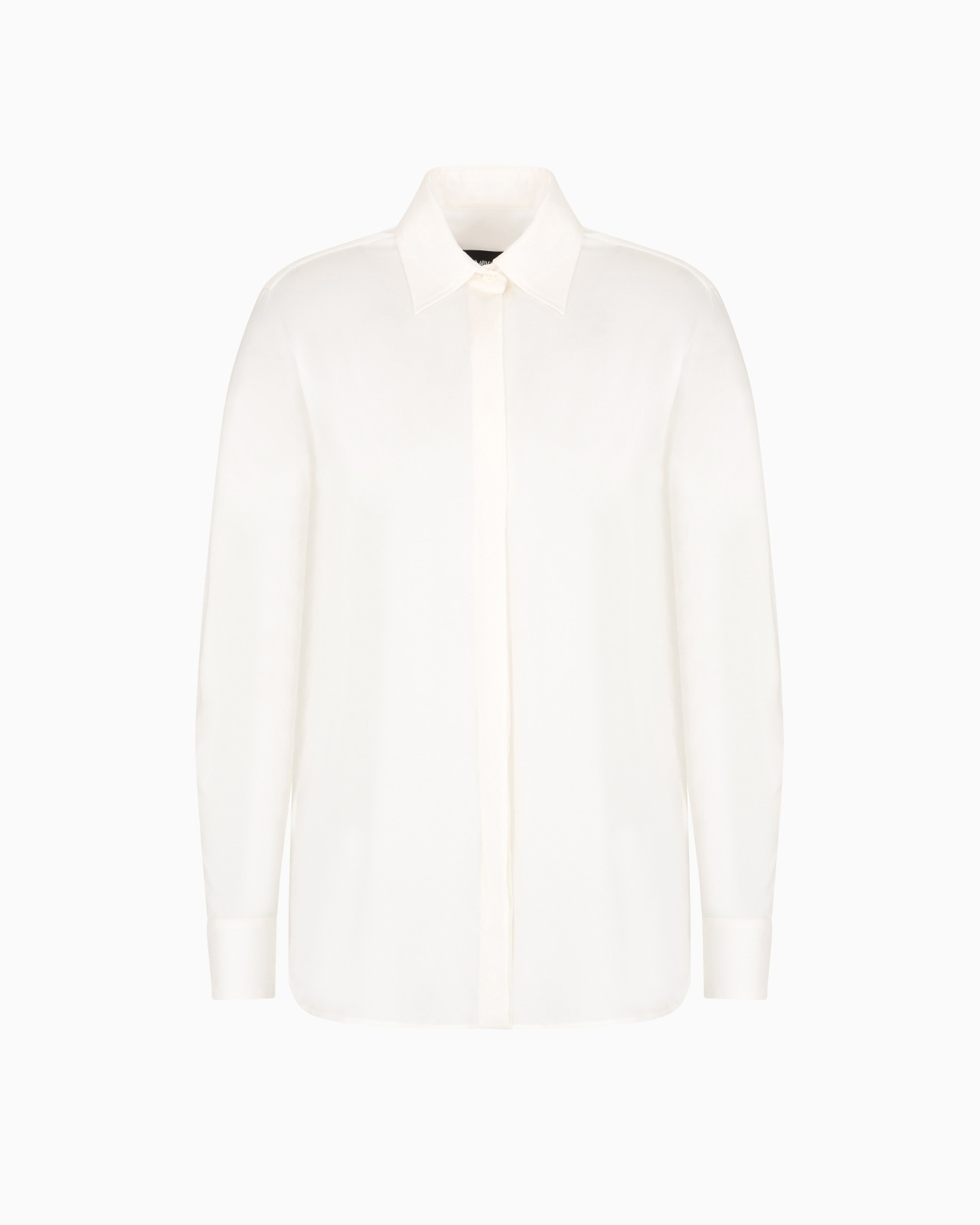 An essential piece for every woman's wardrobe, designed from the heart of Giorgio Armani's sensitivity. Its apparent simplicity conceals a high level of refinement: to avoid creases and an overly baggy fit, every line of this shirt is studied down to the tiniest detail. The premium mother-of-pearl details add an extra touch of elegance. Product Code: 8CHCCZ03TZ1361U1SS Details Composition 100% Silk Crepe Basic solid color Classic Neckline Long sleeves Buttoned cuffs Button closing Fitting The model is 177 cm and is wearing size 38