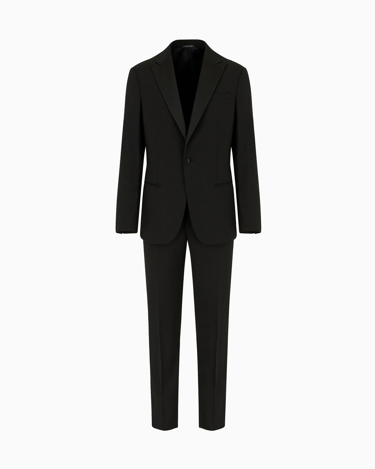 The Icon collection is an aesthetic focus around which the identity of the Giorgio Armani brand evolves. A collection of must-have pieces that represent Armani’s heritage, history and unsurpassed tailoring mastery. Iconic, classic, evergreen designs made from the brand’s signature fabrics and all-Italian craftsmanship. The Soho line tuxedo jacket pairs tailoring traditions with precious, refined fabrics that highlight the garment’s modern look. Made from wool-serge with grosgrain details, it is a single-breasted jacket with two buttons, notched lapels, pockets and a small welt pocket, with side slits at the back. Length 73.,5 cm. Trousers from the classic line have side pockets and welt pockets with a button on the back. Concealed zip and button fastening. Hem width: 19 cm. Lined garment. Product Code: 8CGAS008T00FM1UC99 Details Composition 100% Virgin Wool Icon Soho line tuxedo Single-button, single-breasted jacket Collar with peak lapels Welt pockets Welt breast pocket Lined Jacket length: 73.,5 cm Buttoned, zipped trousers Trouser hem width: 19 cm Made in Italy