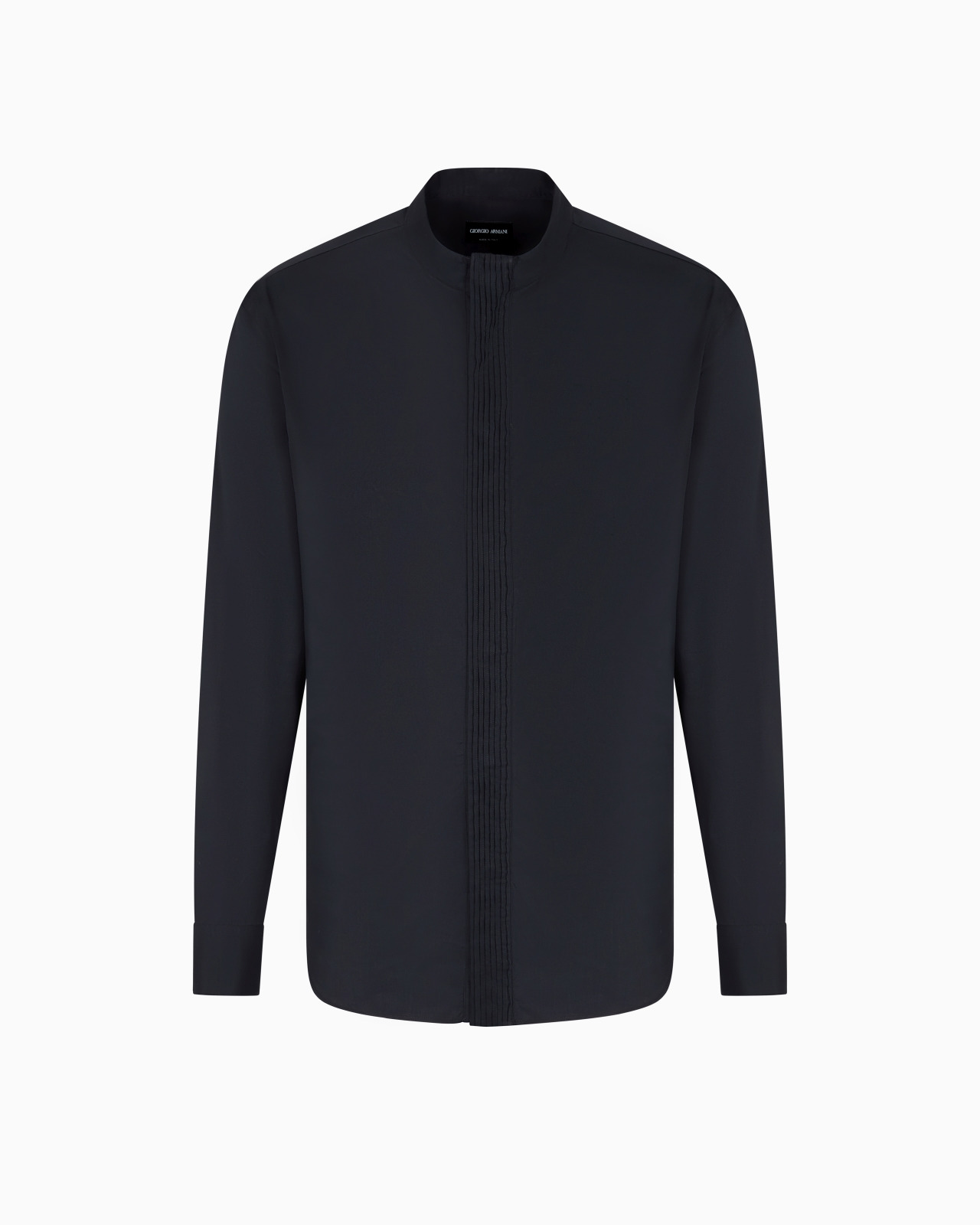 This regular-fit elegant shirt is made from luxury cotton twill. Defined by a guru collar, concealed buttoning and cuffs with a button and slit, a pleated motif on the placket adds distinction. An item that perfectly completes a wide array of looks. Regular fit Guru collar Invisible press-stud closure Pleated placket Cuffs with button and sleeve placket Back yoke Made in Italy Product Code: GM001403TE11189UC001