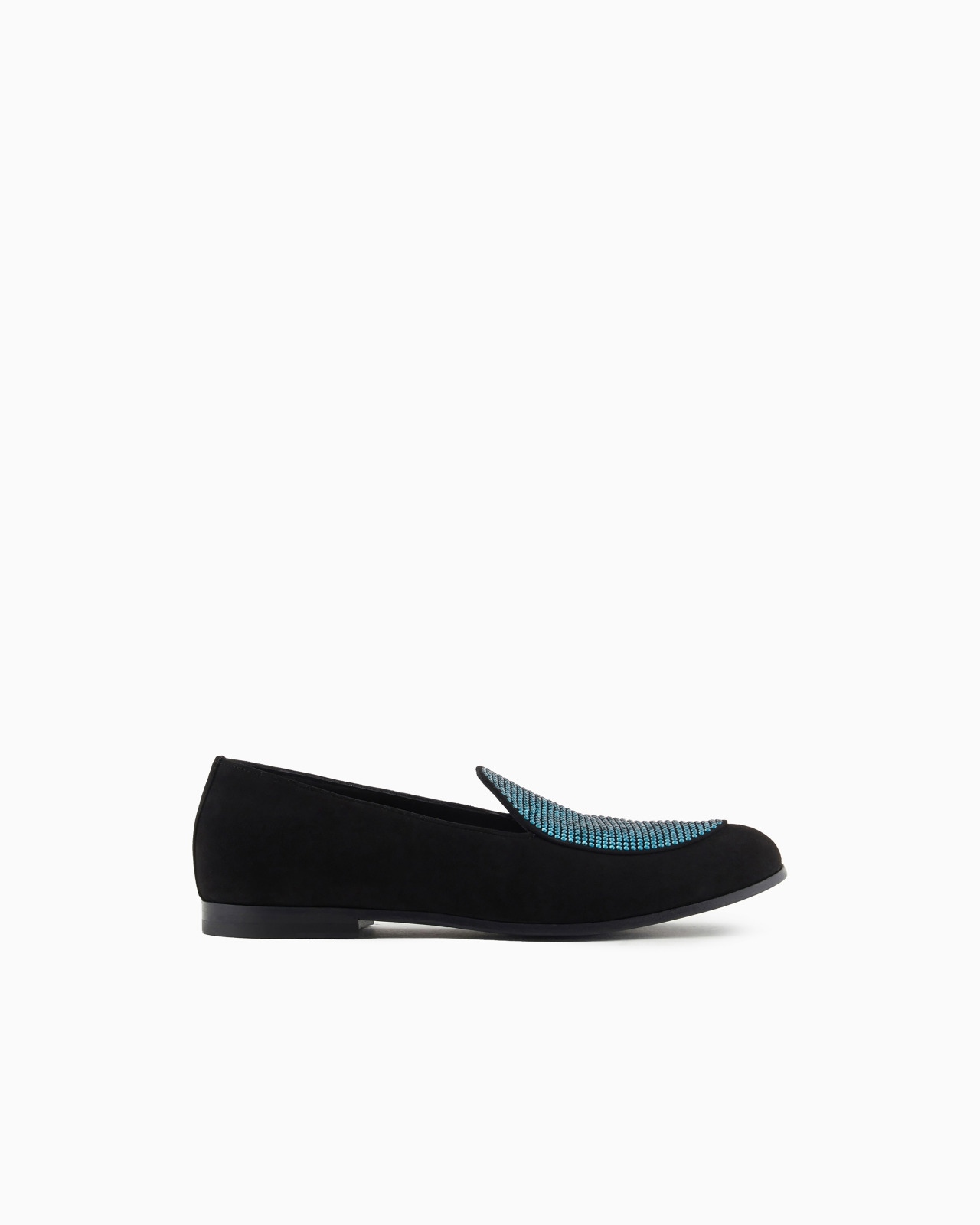 Attractive, understated and sophisticated elegance expressed with modern flair. A shoe inspired by these ideals has become symbolic of the Giorgio Armani world. These exclusive suede loafers are embellished with glistening, applied contrasting rhinestones and trimmed in colour-matched piping. Lightweight, flexible footwear that is perfect for special occasions. The accessory is part of an exclusive capsule collection dedicated to special occasions, reflecting the iconic vision of elegance through the brand’s style codes. A sophisticated, timeless and elegant style in silk with geometric jacquard motifs and dense, luminous velvets that create an alluring play of light. Product Code: X2A405XR1551A158 Details Composition 100% Goat skin Suede upper Leather trim Contrasting pave of heat-adhesive rhinestones on the apron Leather insole Leather soles with rubber inserts