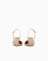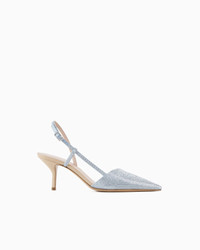 Elegant slingbacks made of satin and illuminated by a pave of matching rhinestones. The style, with a slightly asymmetric top line, comes in the subtle, nature-inspired hues of the collection and features a stiletto heel at a comfortable height and ankle strap for a perfect fit. Delicate and feminine, they will complete numerous looks with a sophisticated touch. Product Code: X1E957XR0951Q974 Details Composition 72% Viscose 28% Mulberry silk Pointy toes Slightly asymmetric top line Ankle strap Leather insoles Leather soles with rubber inserts Covered stiletto heel Heel height: 6.5 cm Made in Italy