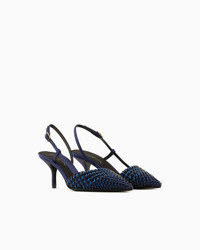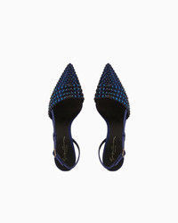 Elegant slingbacks made of satin and mesh and lit up by matching rhinestones. The style with a slightly asymmetric neckline comes in deep evening shades and features a comfortable height stiletto heel and an adjustable strap for a perfect fit. Delicate and feminine, they complete numerous looks with a sophisticated touch.<br>The shoe is part of the exclusive collection that celebrates the connection between Giorgio Armani and the world of Hollywood. A colour palette of deep blues combines with a profound and ever-elegant black, to create a sparkling, luxurious selection inspired by the limelight and most exclusive Hollywood parties. Extremely sophisticated pieces with iconic lines are made of velvets, silks and satins enlivened by crystal and rhinestone embellishments and refined workmanship. Looks for him and her, designed for evenings and special occasions. Pointed toe Slightly asymmetric top line Adjustable strap Insole with signature logo Leather soles with rubber toes Covered stiletto heel Heel height: 6.5 cm Made in Italy Product Code: X1E957XR440U721