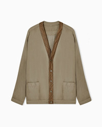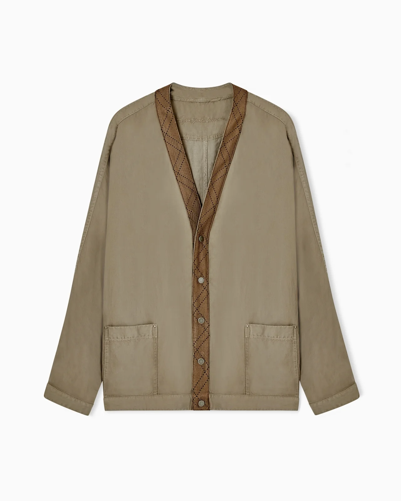 Distinctive shirt jacket made of cupro and linen. A style with a modern allure, featuring relaxed volumes, front buttoning with press studs, patch pockets and contrasting jacquard trim. The style comes with a distinctive matching bag with the Giorgio Armani logo on the front. This laid-back item is the perfect complement for relaxed looks. The garment is part of the Denim collection, an apparel selection featuring rich blue denims and relaxed sportswear-inspired shapes that offer laid-back but sophisticated style. V neck Exposed press-stud fastening Long sleeves Shirt cuffs Two patch pockets Contrasting jacquard trim Matching bag Unlined Made in Italy Product Code: GW002597TE20316U6253