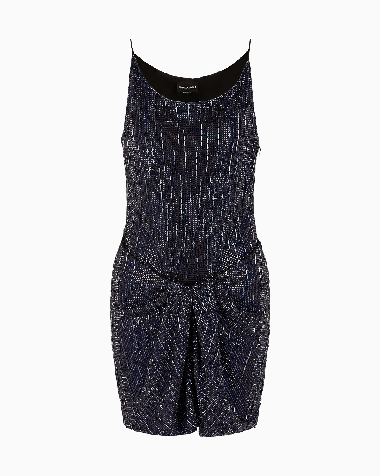 An exclusive and sophisticated style that highlights the fashion house’s skill and craftsmanship for unique designs. This short, silk evening dress is strewn with a shower of delicate, matching, sequin-and-crystal embroidery. It is enhanced with front pleats and piping featuring monochromatic, rod-shaped beads. Product Code: 3SHVR057T03WS1UBUV Details Composition 100% Mulberry silk Rounded neckline Thin shoulder straps All-over monochromatic embroidery with crystals and long beads Pleated motif on front Piping detail with long beads in a matching shade Concealed zip fastening Lined Made in Italy