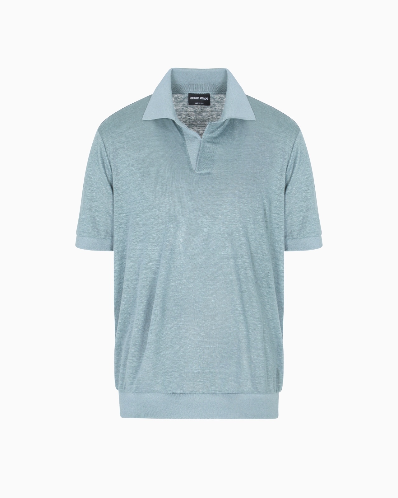 Short-sleeved polo shirt with a modern, laid-back attitude, made from linen jersey with a comfortable, lightweight feel. The clean, streamlined design features a buttonless open collar, and is finished with a matching-tone viscose-knit trim. A piece designed to complete informal looks when worn with the collection’s trousers and bermuda shorts. <br>The piece is part of the Holiday selection that plays with a striking colour palette, incorporating black onyx, sky blue and ivory. Such shades are combined with luxurious fabrics like linen and silk, and iconic ones, like cupro and Lyocell, creating a unique experience in texture. Modern, relaxed shapes dress up different occasions with unmistakable Giorgio Armani style. Open polo-shirt collar Short sleeves Matching viscose-knit collar, cuffs and hem Made in Italy Product Code: GM001996TE11335U9228
