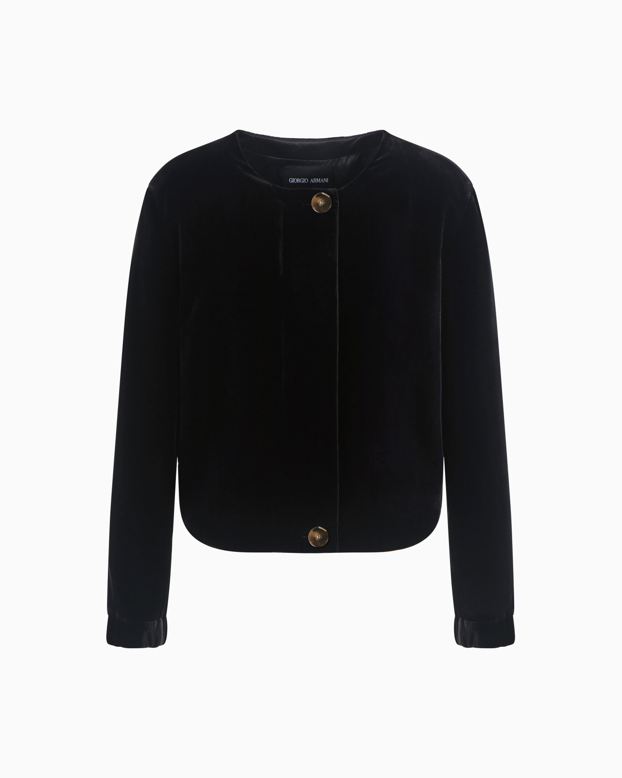Sophisticated short jacket made of lush, smooth velvet with black satin details. The crew-neck style has a single-breasted closure with special logo buttons and a covered elasticated detail at the cuffs and hem. Its streamlined, elegant line dresses the feminine silhouette with elegance, for perfect evening wear looks. Product Code: GW001352TE108311UC001 Details Composition 80% Viscose 20% Mulberry silk Crew neck Single-breasted closure with special logo buttons Internal elastic at the cuffs and hem Lined Length: 48 cm Made in Italy