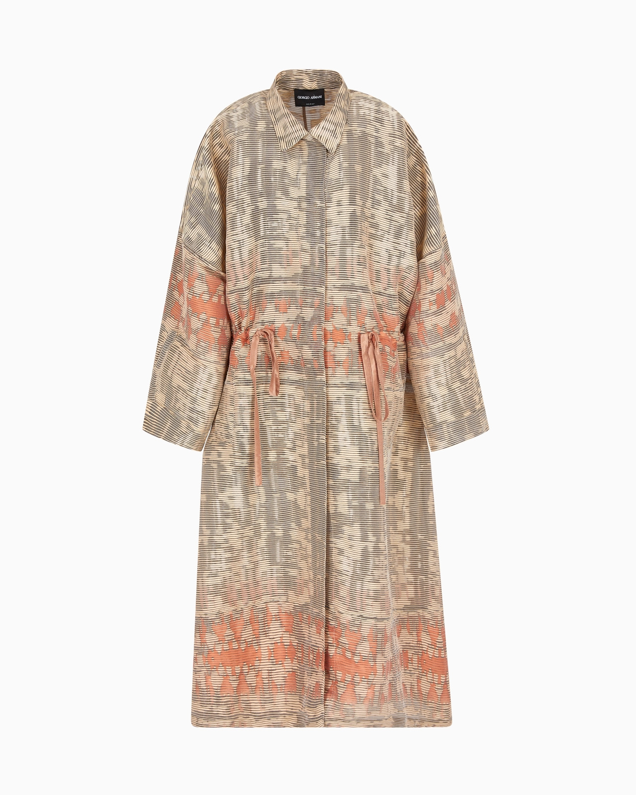 Sophisticated long overcoat made of a silk blend cannete, animated by a sophisticated jacquard design that reinterprets the urban tiger motif, the recurring theme of the entire collection. An elegant, luxurious offering, it features a drawstring with matching ribbons and wide sleeves brightened up by the distinctive yarn, perfect for pairing with other creations from the collection for chic looks with a romantic allure. Shirt collar Closure with concealed press studs Two vertical pockets Drawstring waist with matching ribbons Wide kimono sleeves Unlined Length: 135 cm Made in Italy Product Code: GW000930TE14275F1080