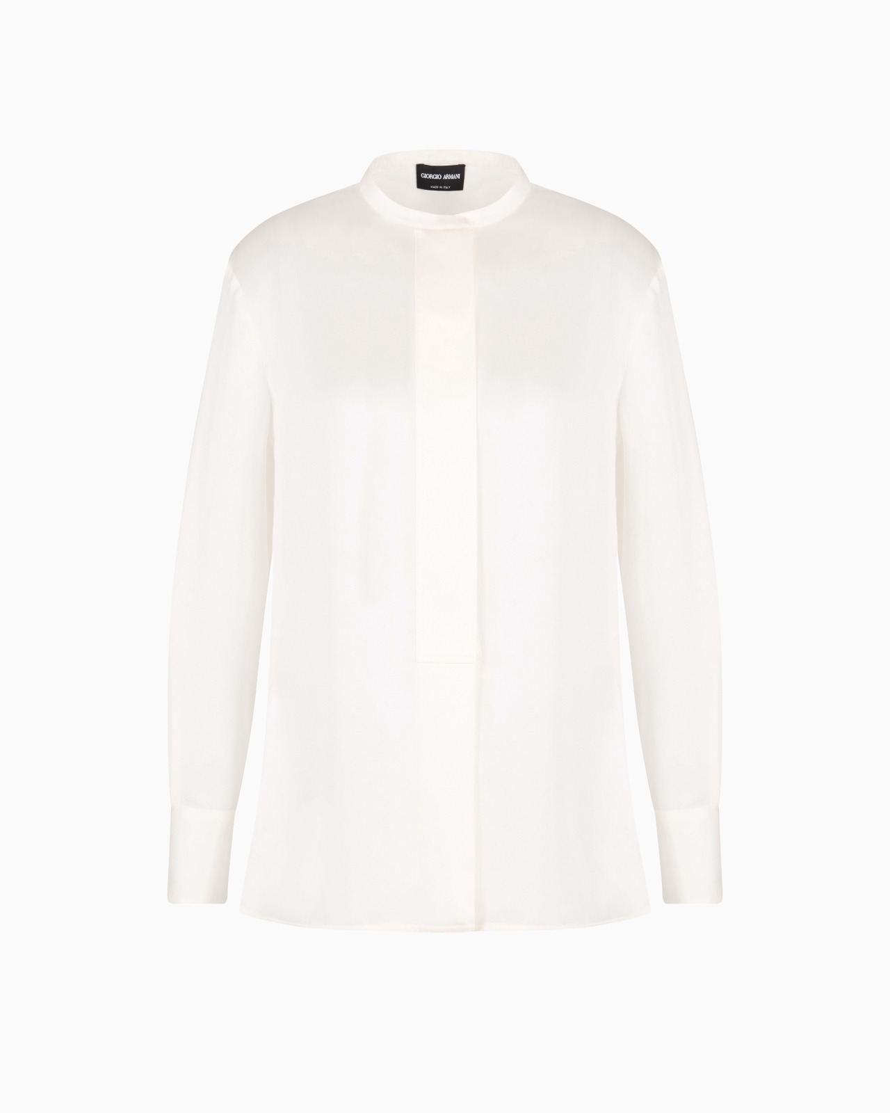 This elegant, silk-charmeuse shirt is defined by an evergreen design. Sophisticated and versatile, it features a guru collar and wide buttoned cuffs, completing formal daytime looks and refined evening outfits when worn with the collection’s trousers and skirts. Product Code: 2WHCC03YT03Q21U1SZ Details Composition 100% Silk Guru collar Long sleeves Faced placket with button closure Back yoke Two-button wide cuffs Made in Italy