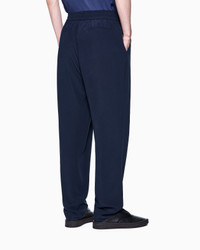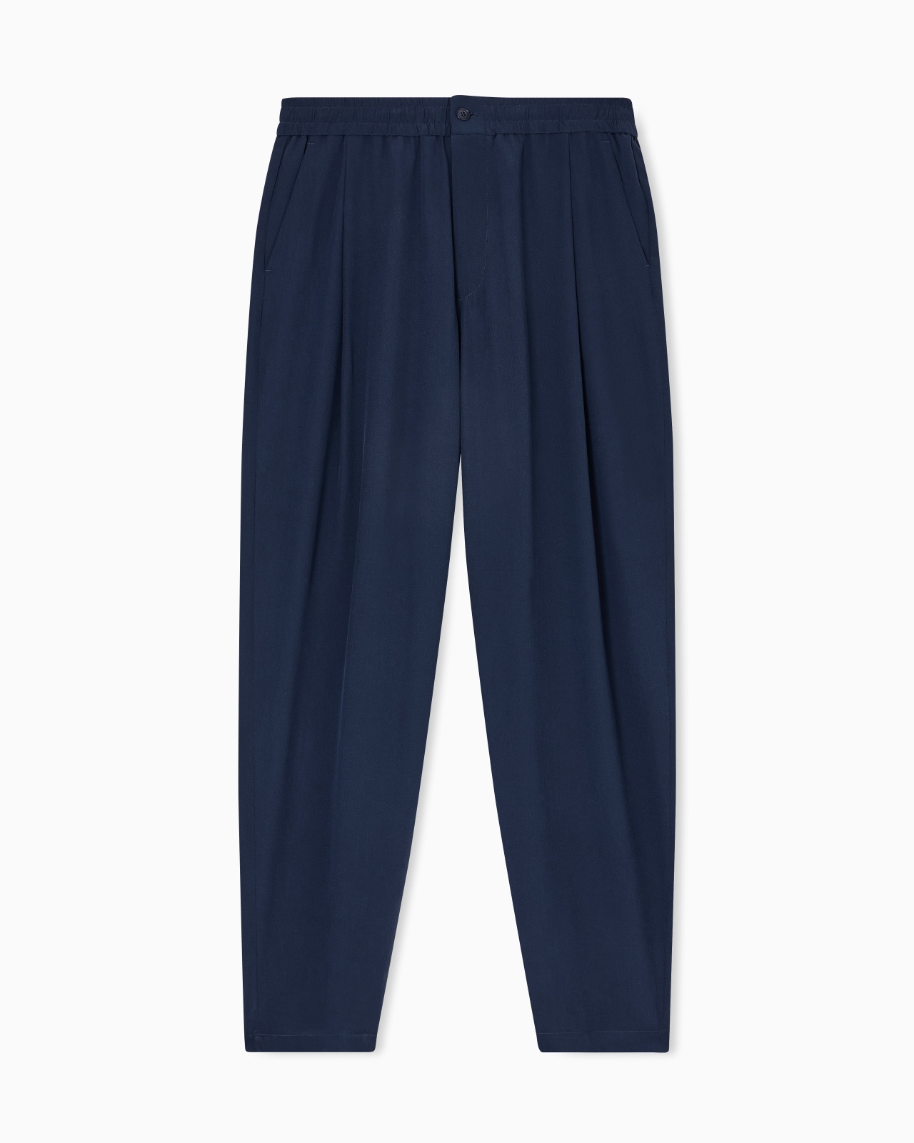 Made from silk crepe, these flat-front trousers are available in the collection’s colour palette. The style features an elasticated waist with drawstring and has side and back pockets, the only details that embellish its clean, minimalist lines. A relaxed and versatile offering that is perfect with relaxed shirts or T-shirts.<br>The piece is part of the Holiday selection that plays with a striking colour palette, incorporating black onyx, sky blue and ivory. These shades are combined with luxurious fabrics like linen and silk, and iconic ones, like cupro and Lyocell, creating a unique experience in texture. Modern, relaxed shapes dress up different occasions with unmistakable Giorgio Armani style. Elasticated waist with drawstring Two side pockets Two back welt pockets Cuff width: 18 cm Made in Italy Product Code: GM001744TE16749UB100