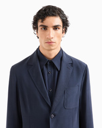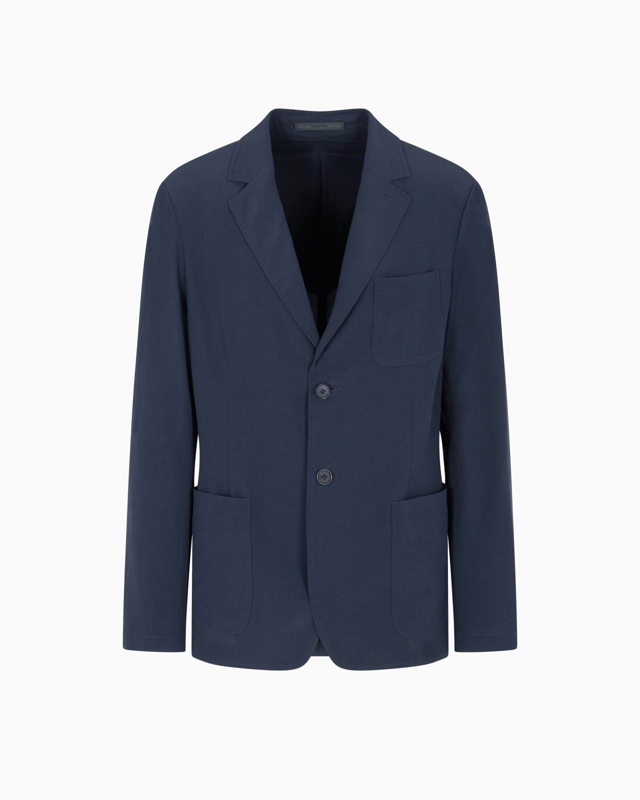 Single-breasted jacket, made of silk crepe, available in the collection colour palette. The style, with notched lapels and patch pockets, is a versatile offering designed for day-to-night use. <br>The piece is part of the Holiday selection that plays with a striking colour palette, incorporating black onyx, sky blue and ivory. These shades are combined with luxurious fabrics like linen and silk, and iconic ones, like cupro and Lyocell, creating a unique experience in texture. Modern, relaxed shapes dress up different occasions with unmistakable Giorgio Armani style. Single-breasted jacket Notched lapels Two-buttoned, single-breasted closure Breast patch pocket Two front patch pockets Buttons at the sleeve hem Unlined Length: 73 cm Made in Italy Product Code: GM001935TE16749UB100