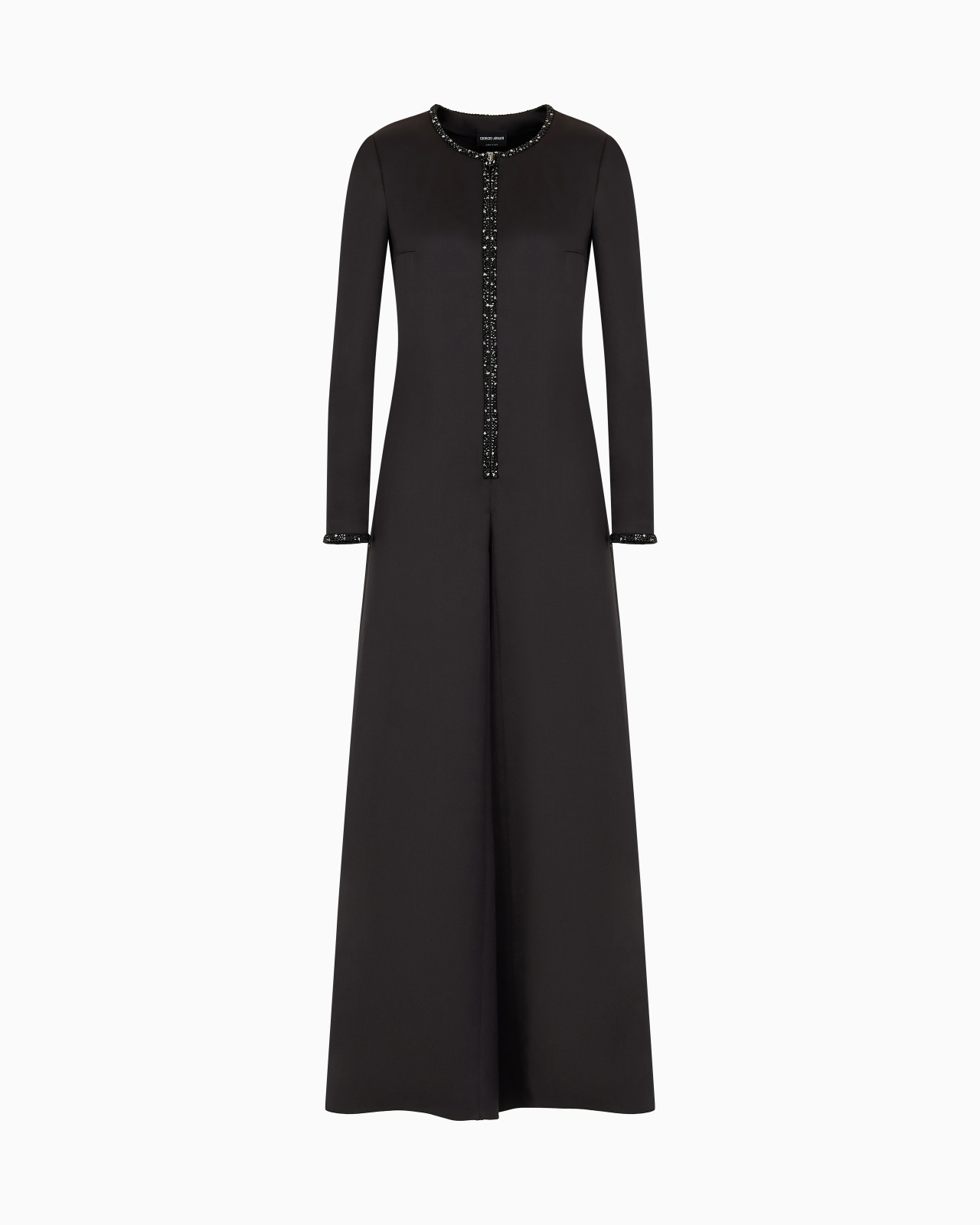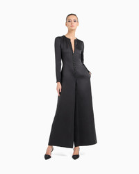 Refined silk jumpsuit, available in an intense collection black that enhances the brilliance of the yarn. It has a minimalist construction with long sleeves, a front zip fastening and a wide leg. Illuminated by edges embroidered with black rhinestones and silver stars, which adorn the neckline, placket and cuffs like jewellery, it is an elegant and sophisticated offering, perfect for the evening.<br>The piece is part of the exclusive collection that celebrates the connection between Giorgio Armani and the world of Hollywood. A colour palette of deep blues combines with a profound and ever-elegant black, to create a sparkling, luxurious selection inspired by the limelight and most exclusive Hollywood parties. Extremely sophisticated pieces with iconic lines are made of velvets, silks and satins enlivened by crystal and rhinestone embellishments and refined workmanship. Looks for him and her, designed for evenings and special occasions. Crew neck Front zip closure Long sleeves Wide-leg trousers Two side pockets Embroidered details with black rhinestones and small silver stars applied at the neckline, placket and cuffs Unlined Length: 110 cm from the waist Made in Italy Product Code: GW001488AF17832ZZ017
